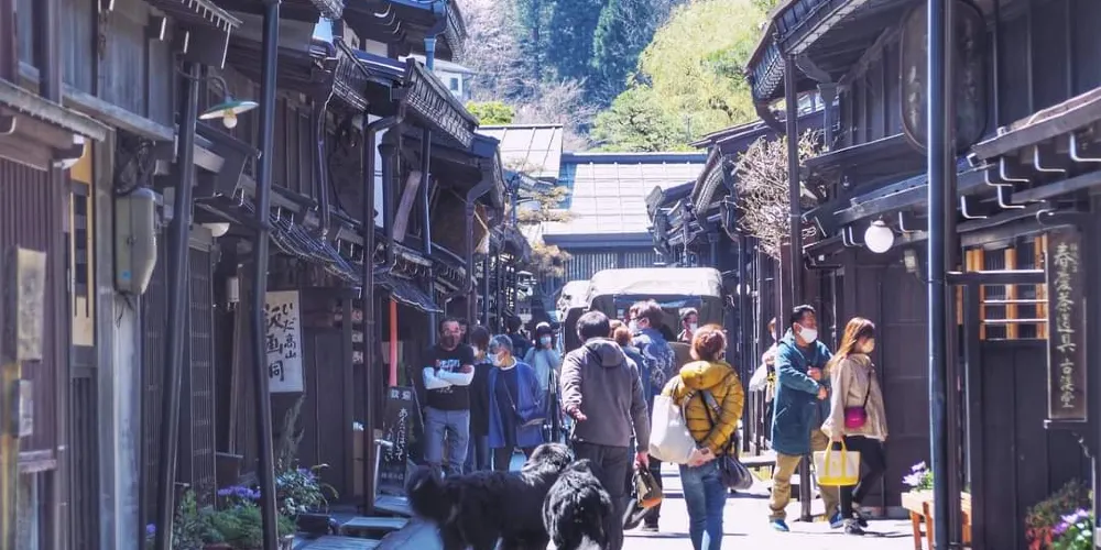 在流經飛彈高地內的宮川河東岸,有一條古老的街道。這條古街中段的三町,江戶時代的住宅保存完好。這條古街,仍能清楚勾勒出城堡城市「高山」的影子。到此一遊,您可親眼觀賞到傳統酒坊及帶有突出格子門窗隔扇的古老住宅。這個地區,已指定為「重要傳統建築群保護區」。