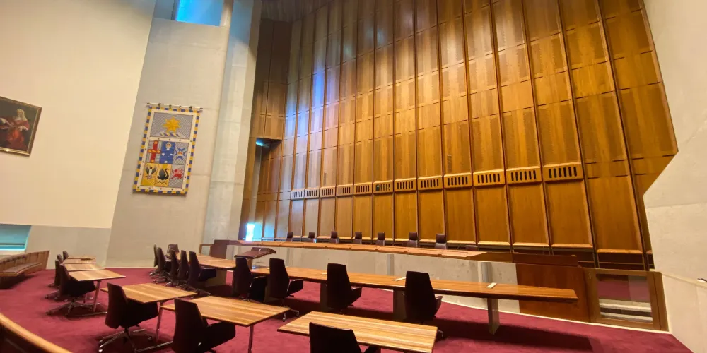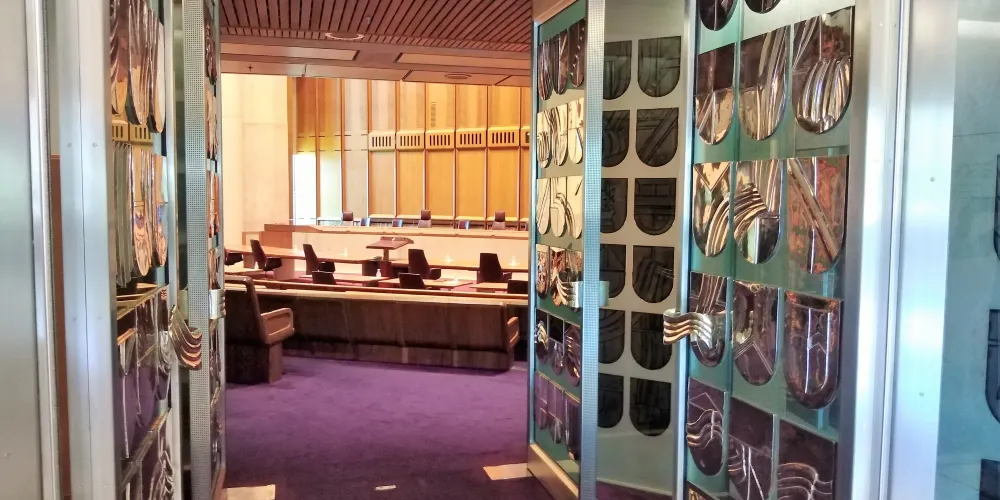 參議院的格式與眾院相同,但是是紅色的。參議員共有76席,每州12名,澳大利亞共有六個州:最西部是西澳大利亞州;中部上面是北領地;下面是南澳大利亞州;東部有三個州,從上往下為昆士蘭州;新南威爾士州和維多利亞州。首都堪培拉特區出兩名,土著人出兩名。在正中間議長坐席後有一把椅子是英國女皇的位置,平時是空的,在它旁邊還有一把椅子,是供外國元首參加會議時坐的。