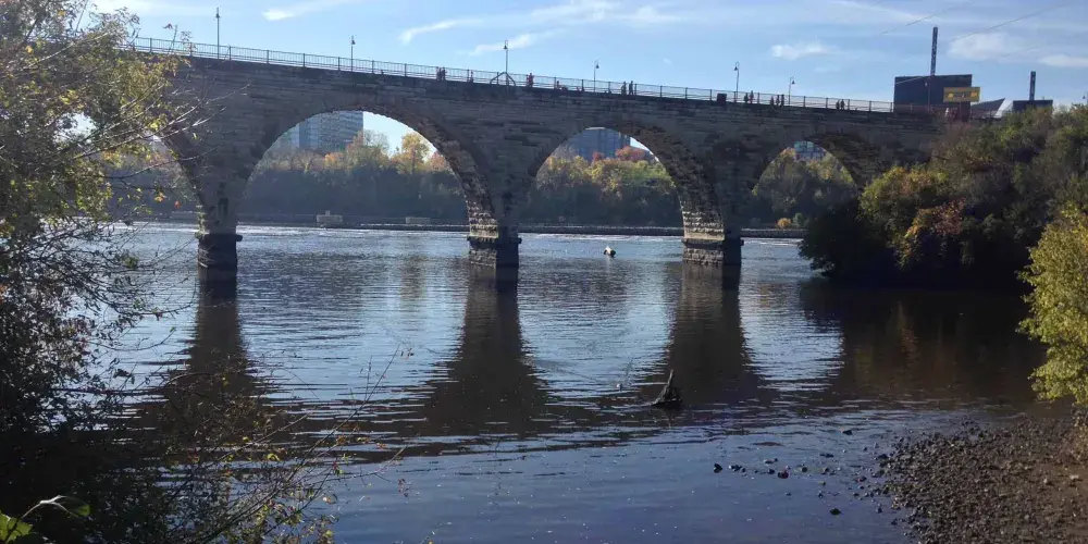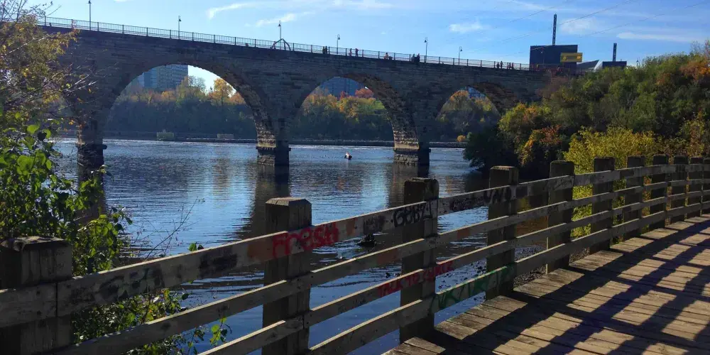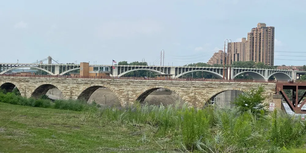 這座橋如今是不能行車的,衹能步行或者騎自行車,不過你可以從旁邊的高速公路開車駛過,從側面觀看這座橋。拱橋的附近是明尼蘇達州2007年35號公路跨橋的紀念點。