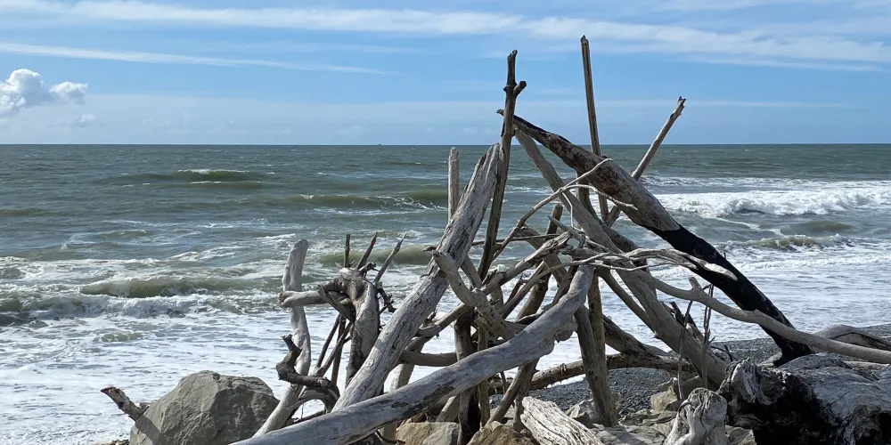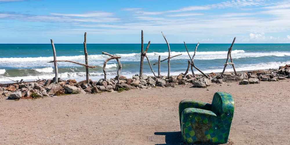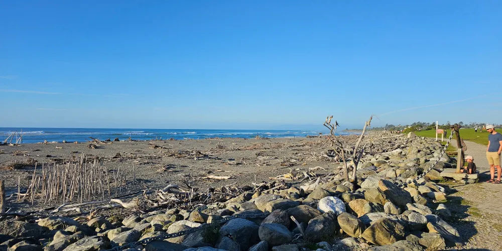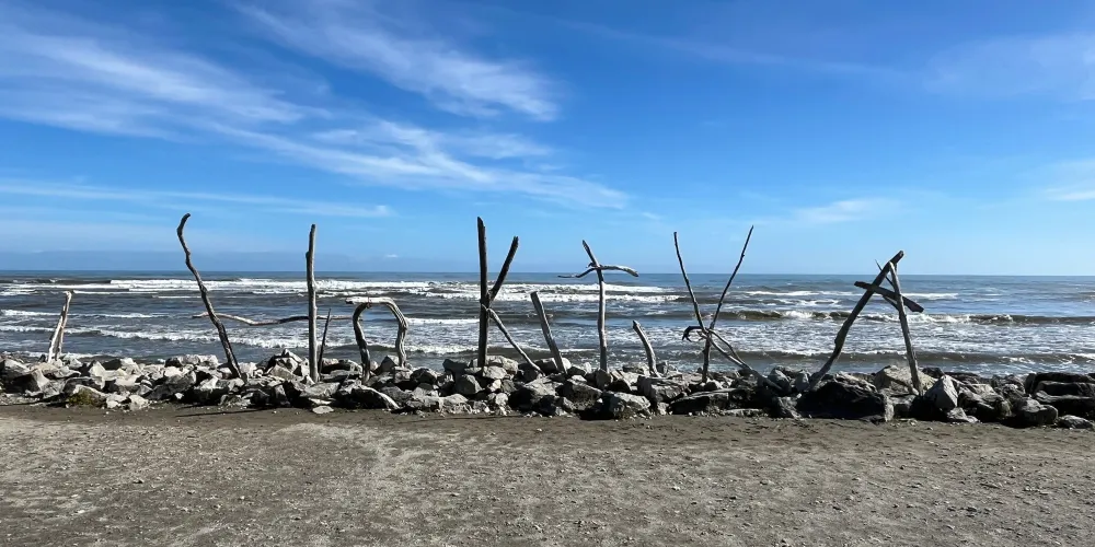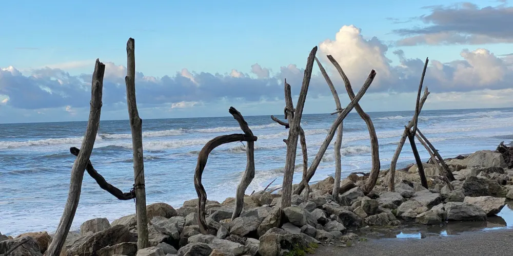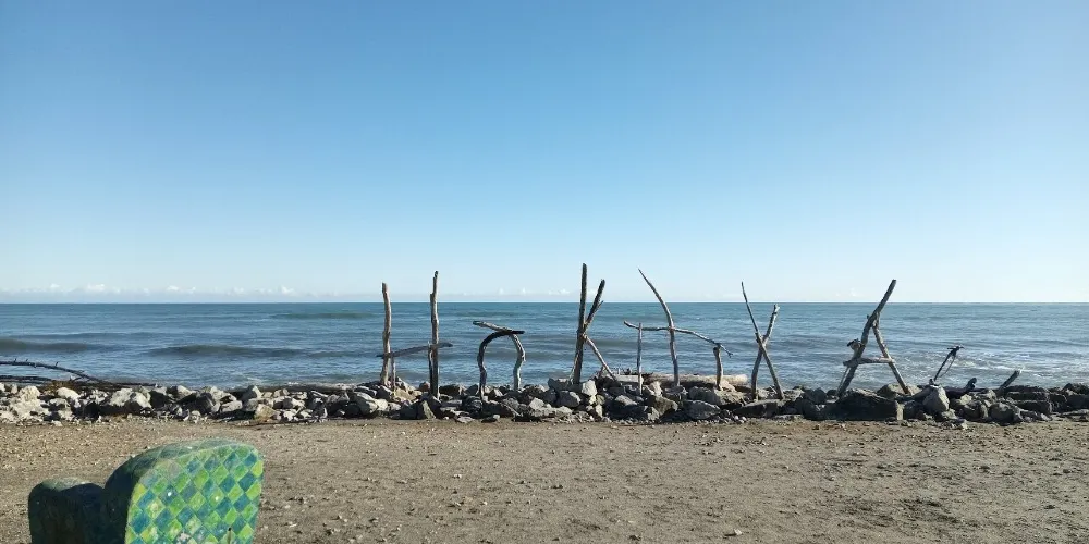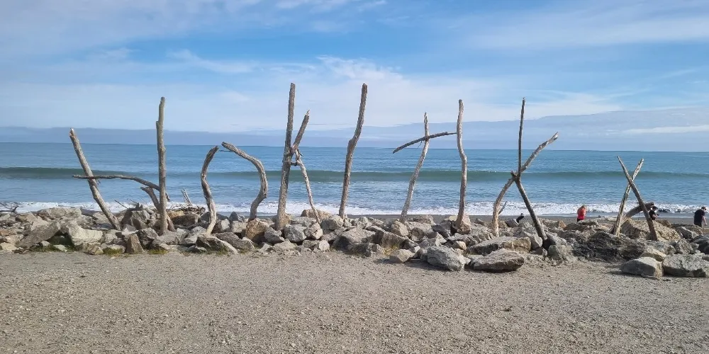 在小城的中心街道就能找到寫着HokitikaBeachAccess的木製的牌子,走進去就能看到一片非常壯闊的海灘。在晴天,綠草茵茵,藍天白雲,黑色沙灘上有白色的石頭。海灘上還有各地藝術家用樹木做出的藝術品,非常漂亮!