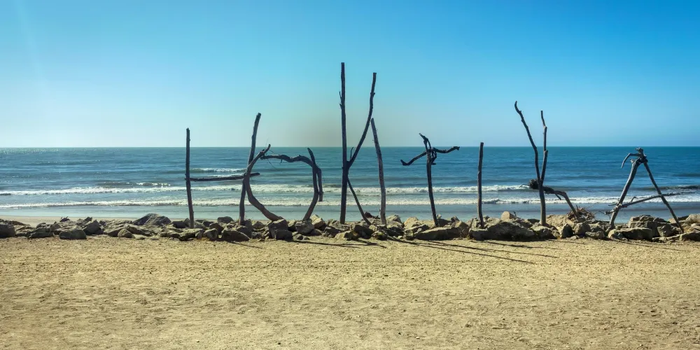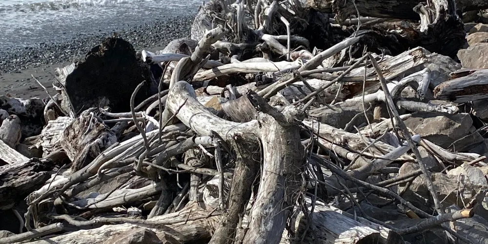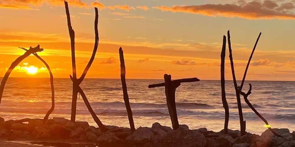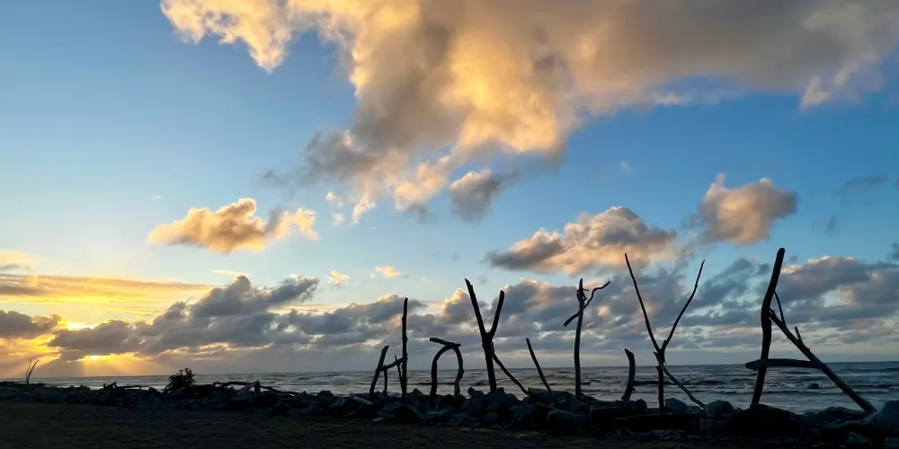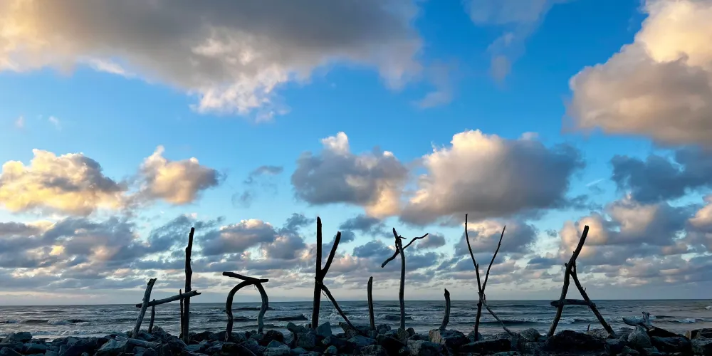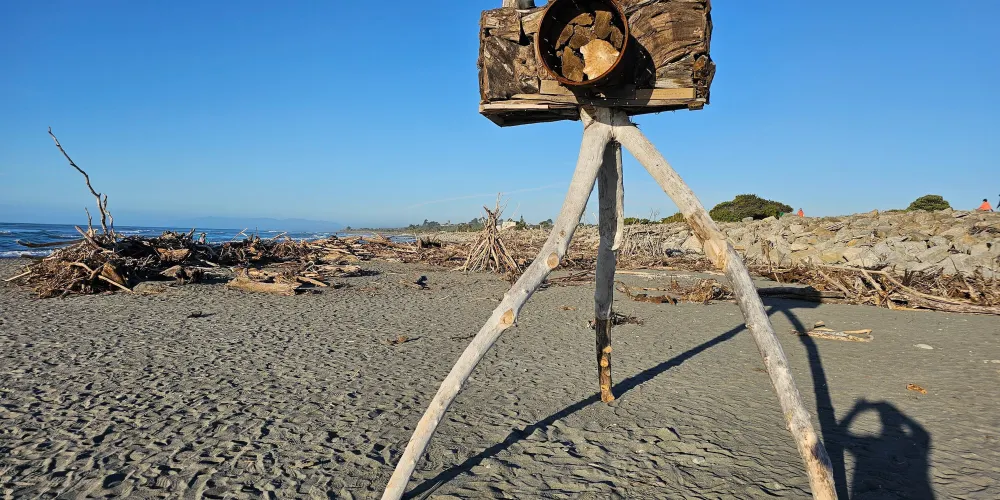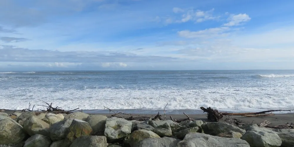 在小城的中心街道就能找到寫着HokitikaBeachAccess的木製的牌子,走進去就能看到一片非常壯闊的海灘。在晴天,綠草茵茵,藍天白雲,黑色沙灘上有白色的石頭。海灘上還有各地藝術家用樹木做出的藝術品,非常漂亮!