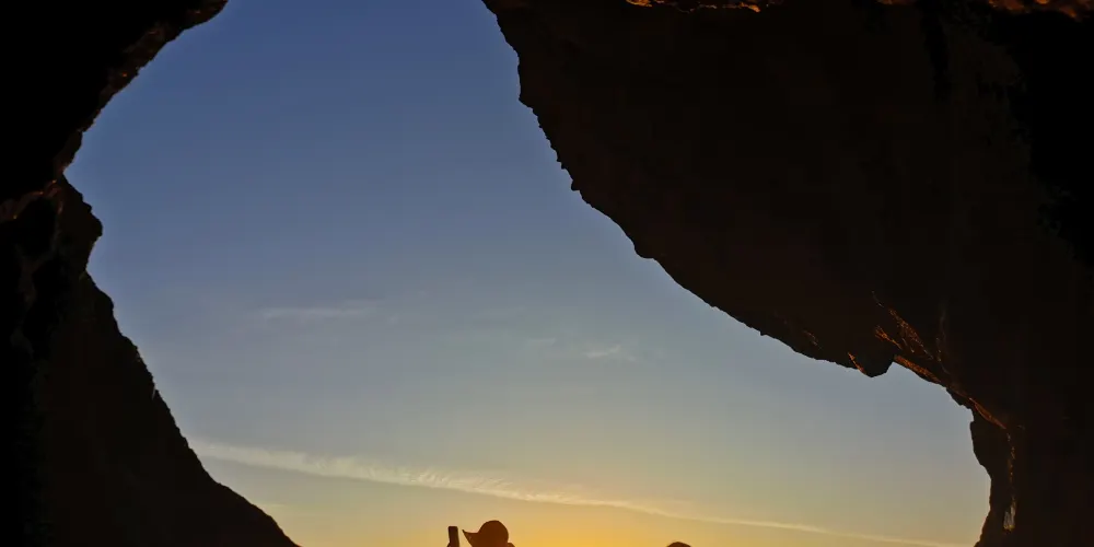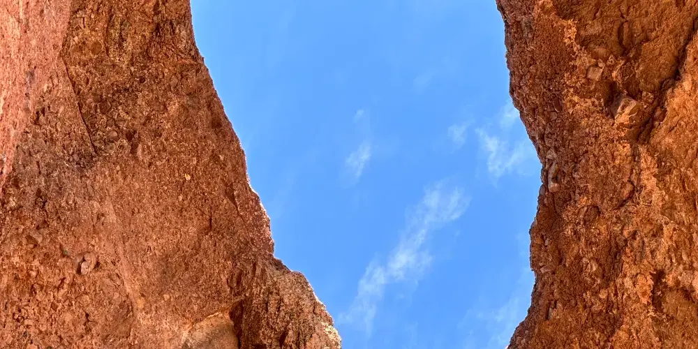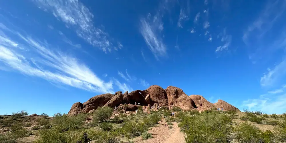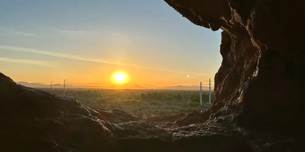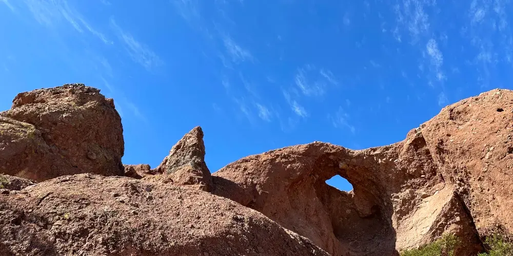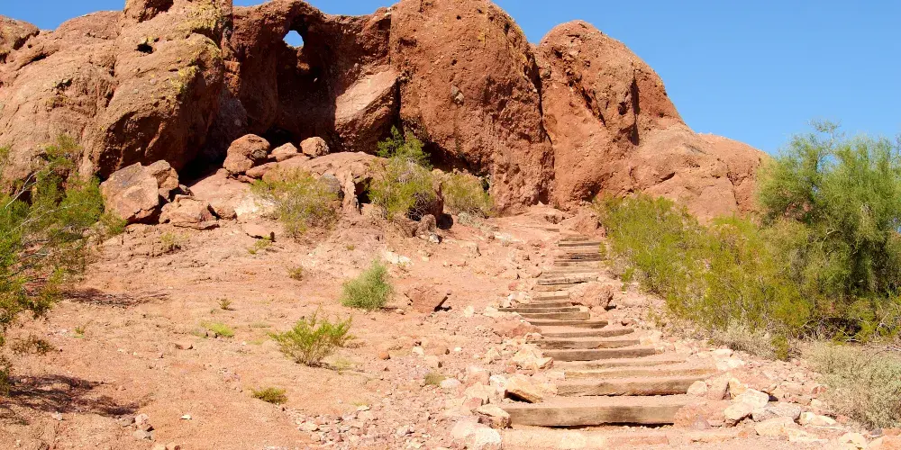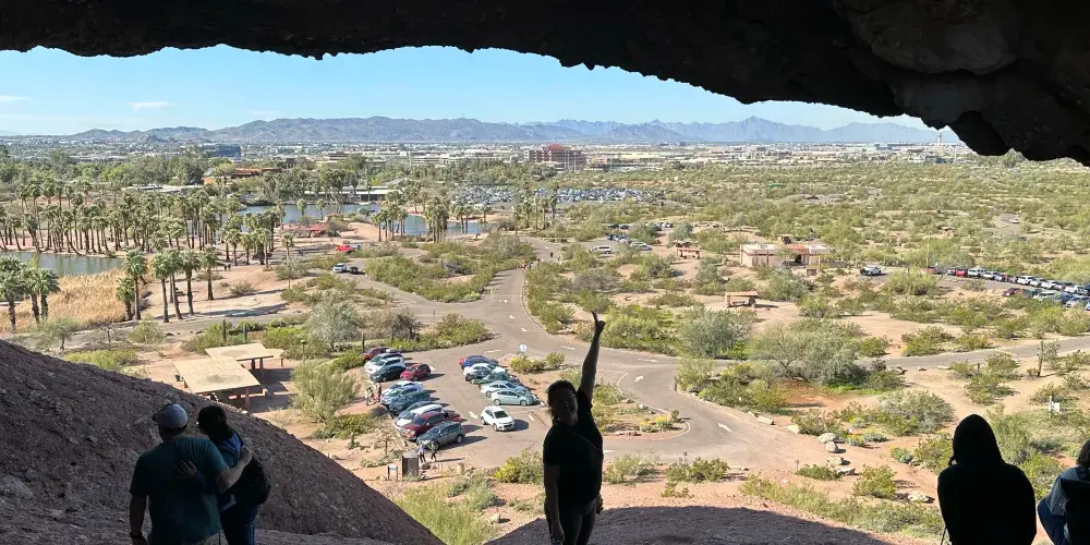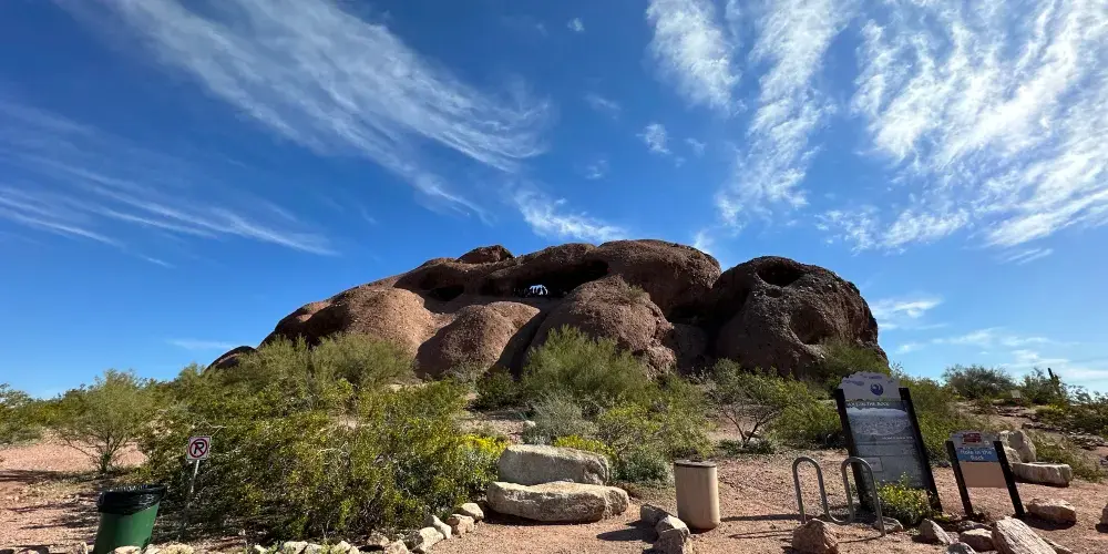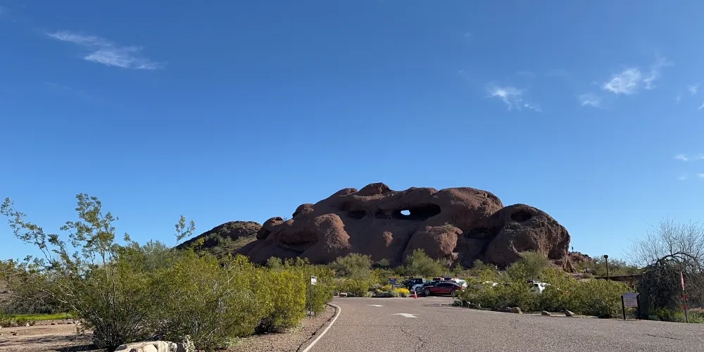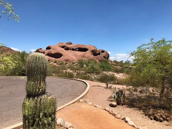 這奇特的岩石結構上有著因侵蝕而形成的巨大空洞,其中一個洞口極為寬敞,貫穿至岩石另一側。從停車場出發,只需輕鬆徒步 10 分鐘,踏上一條僅 0.3 英里長的小徑,就能抵達此處。站在洞口,彷彿打開了一扇通往奇妙世界的窗,能將帕帕戈公園的壯美景色盡收眼底。遠處沙漠風光綿延,與週邊的城市景觀相互映襯,別具一番風情。在晴朗的日子裡,陽光灑在紅色砂岩上,色彩格外鮮豔;日落時分,柔和的光線將天空染成橙紅色,更是為這裡增添了幾分浪漫與神秘。