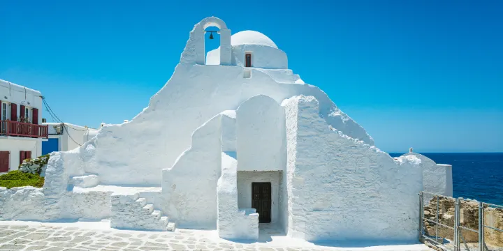 帕拉波爾蒂尼教堂位於Kastro區,是米科諾斯最著名的白色教堂,是拜占庭式教堂的瑰寶,由四座教堂合而為一。教堂分上下兩層,上層的禮拜堂現已關閉,下層禮拜堂有一扇小門,因此也被稱為”小門教堂“。