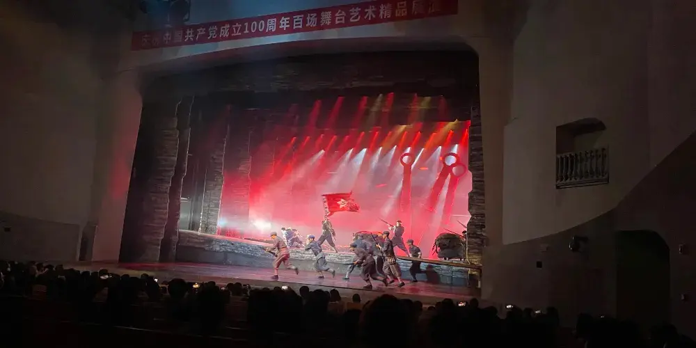 紅秀《延安 延安》每日兩場演出,以真實歷史背景為基礎,重現當年的革命熱情。1936年,斯諾輾轉來到延安,記錄了紅軍當時在延安的生活見聞。1937年10月,《紅星照耀中國》出版,迅速在風雨飄搖的舊中國掀起紅色風暴,吸引大批青年知識分子投奔延安。上海姑娘白雁鳴帶著浪漫的革命情懷奔赴延安,與長征中倖存下來的革命軍人歐陽堅相遇,二人共同經歷了轟轟烈烈的大生產和大魯藝,在火熱的生活中深深相愛。因戰爭失去全家的陝北男娃栓柱,信念就是生存下去,他在革命的隊伍中重新找到歸屬,將歐陽堅和白雁鳴視作兄姐,三人親如一家。然而,日軍並沒有放過延安這片熱土,一次飛機轟炸中,白雁鳴和歐陽堅為救助陝北老鄉,犧牲在炮火之中。再度失去親人的栓柱從悲痛中站起,繼承二人遺志東渡黃河北上抗日,掀起革命的滾滾浪潮……