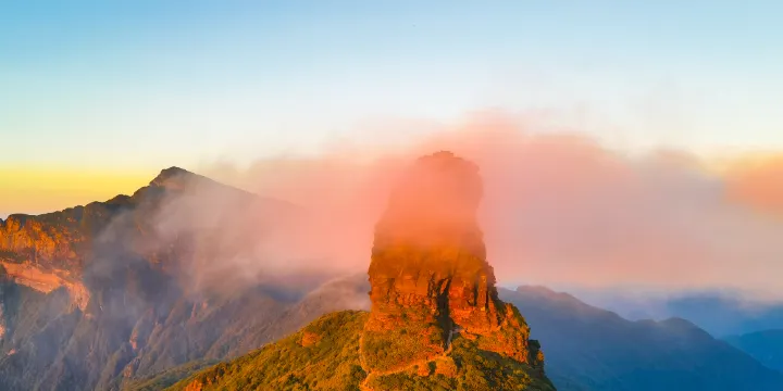 紅雲金頂石峯位於梵凈山景區內,高達94米,挺拔峻峭,像一根巨大的擎天石柱拔地而起。它與月鏡山南北相望,形成兩峯對仗之勢,景緻極其壯觀。金頂石峯下臨深壑,於百里以外遙望,有如玉筍插天。其頂部常有雲霧繚繞,在陽光的輝映之下,雲彩燦爛絢麗,因此被稱為“紅雲金頂”,諧“鴻運金頂”之音。