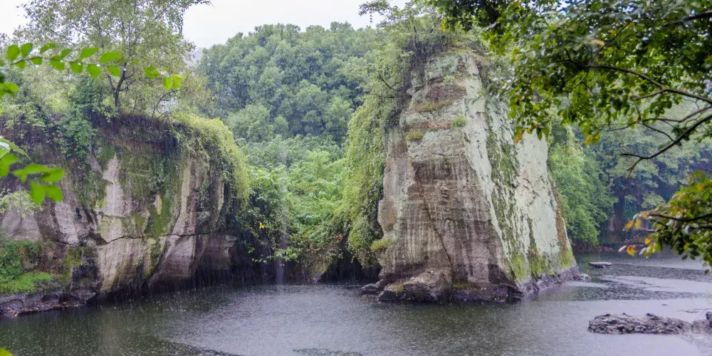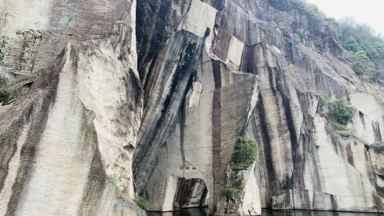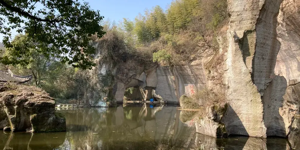 東湖面積不大卻煙波浩渺,給人一種小巧而有靈氣的感覺,因此東湖被人們比作“山水盆景”。此外,這裡也是82版《西遊記》中女兒國的取景地。東湖曾是一個採石場,兩岸是當年採石留下的陡峭山崖,這些開鑿的痕跡被山泉沖刷出一道道斑斕的色彩,煞是好看。還有一些窄窄的石洞,有的僅能容一艘船經過,很奇妙,因此乘烏篷船遊東湖也是許多人來此的理由。