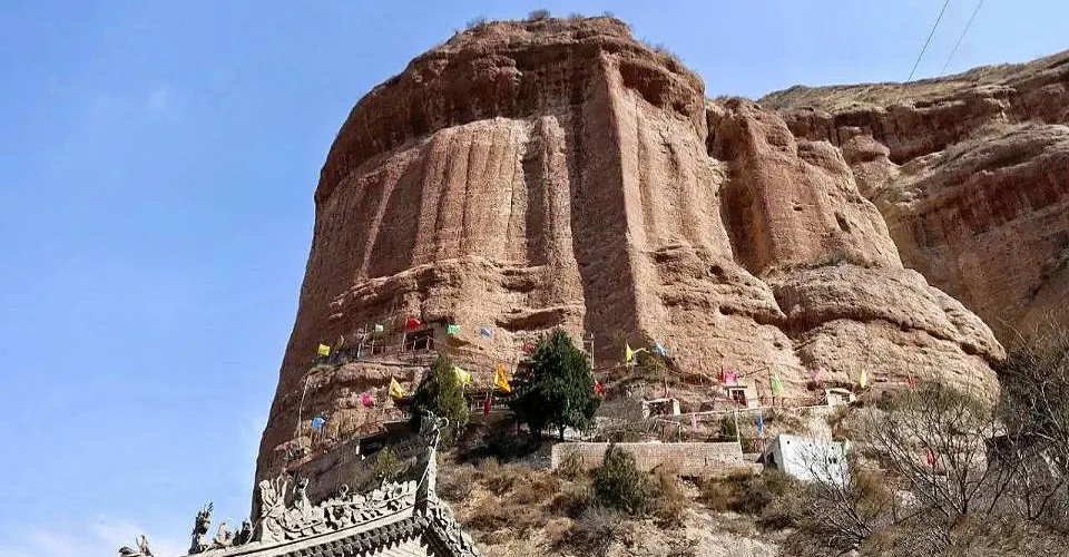 從甘穀縣城沿316國道向西行,華蓋寺石窟位於甘穀縣城西10裡,渭河南岸的二十鋪村東頭。因山頂綠草如茵,恰似一頂紅教僧帽,戴在狀如圓柱的紅色懸崖之上,故當地人叫它喇嘛帽頂。又因山勢奇特,一峰突起,似刀削斧劈,直入雲端,如一把紅縵綠頂的華蓋依山亭立,山崖以上“之”字形排列的洞窟參差錯落,狀如蜂房故稱華蓋洞。