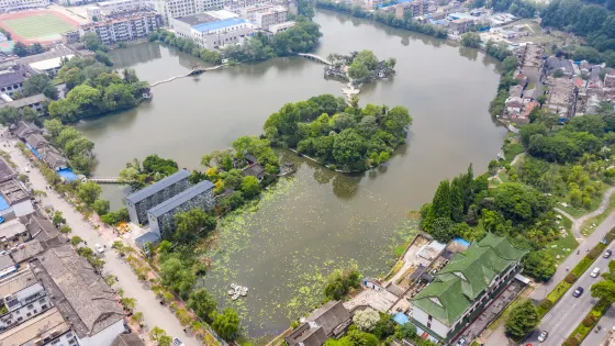 4.9 分58 則評價距離市中心 距離市中心5公里勺湖園,碧水、長橋、畫舫、亭閣、碑園、相映成輝,更有文通寶塔聳立湖畔,塔影、波光、鳥語給勺湖園平添了幾多文化的品位。勺湖因形似一把勺子而處名,擁有水面114畝,陸地40畝。這裏自古即為淮安名勝。據説從隋唐時代起,這裏建有著名寺院,來此遊歷或焚香膜拜者常年不絕。而這建勺湖公園。半個多世紀以前,當代一位偉人童年時曾在這裏留下足跡(注),來此觀賞的人們,每念及此,遊興陡增。當你踏進"文通塔苑"的門檻,首先撲入眼簾的是雙亭迴廊。過文通塔,即踏上勺堤,左側是綠波蕩漾的湖水,右為與淮中校園毗鄰的白身青檐的雲牆。由此向東北眺望,清晰可見遠處的兩道玲瓏別緻的洞門,令人的芳徑通幽之感。這雖然還比不上濃粧淡抹相宜的杭州西湖那麼美,但與江南一般園林相比,是毫不遜色的。過了兩道洞門,園中的一些古色古香的建築即呈現眼而這些建築,皆順着地形水勢,變代多樣,色彩柔和宜人,莊重而淡雅。湖心島上原大悲閣舊地,現建的一座廳堂,東側的貼水曲廊和扇形水榭,湖中建的石舫,舫上有兩層樓閣,登樓可鳥瞰全湖景色。湖心島南北有虹橋與陸地相連。明代進士阮葵生當年講學的勺湖書院也按明朝時候的建築風格修復好了,西側還增建一座春風亭,供探遊者休憩。在橋畔舉目平視,但見二三遊艇劃破水底藍天,其景別有一種情趣。