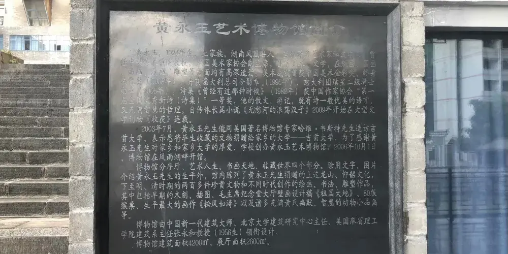 黃永玉藝術博物館位於湖南省湘西吉首市,依湖而建,風景秀麗。博物館建築面積四千多平米,分為分序廳,藝術人生,書畫天地,收藏世界等多個區域。其中書畫天地展廳陳列的主要是雕塑、木刻、繪畫、書法等作品,收藏世界展廳展出的是中山國陶塑羣、戰國至漢代的陶器等文物。