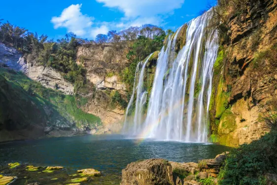 瀑布水沿著瀑面傾瀉而下,聲勢浩大,場面蔚為壯觀,令人驚嘆。運氣好的話還可以看到美麗的彩虹。這裡也是86版電視劇《西遊記》片尾曲的取景地。