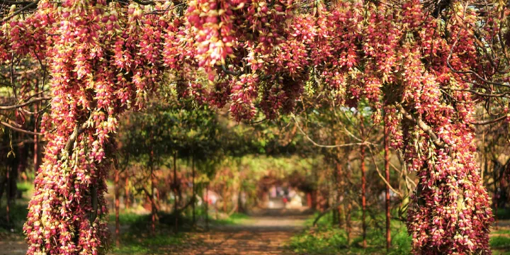 黃金布五彩禾雀花基地位於廣東省清遠市。這裡生態環境得天獨厚,常年四季如春,鳥語花香,既是禾雀花種植科研培育基地,也是人們觀光休閒的理想勝地。每年禾雀開花時節,數以萬計遊客都慕名前往觀賞和拍照。此處的禾雀花基地內總共種植禾雀特色品種5個,分別有紅色、紫色、粉紅色、米黃色、白色。春季是觀賞禾雀花季節,花期長達一個月左右,禾雀花是一種季節性植物,因形酷似禾雀而得名,開放時繁花似錦,所以頗具觀賞價值。