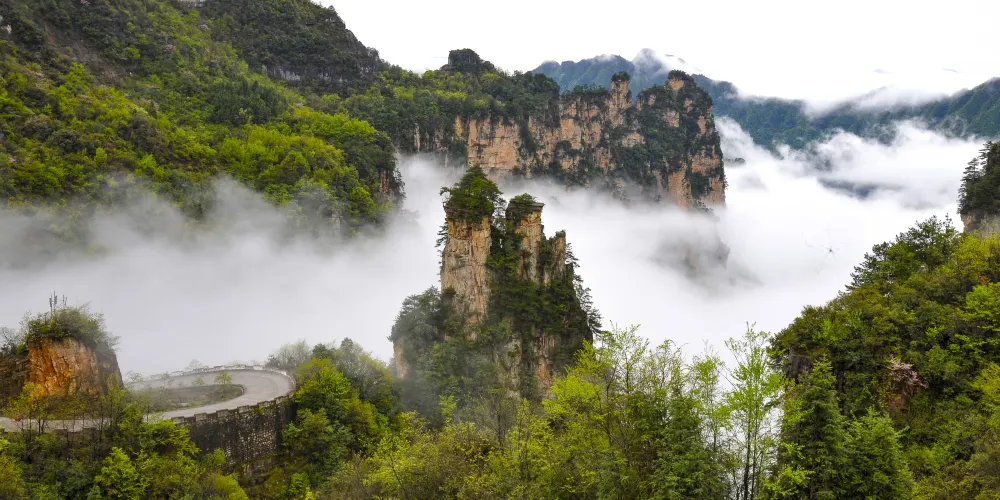 武陵源的山峰與世界各地的名山大不相同,在這片398平方公里的區域內,聳立著三千多座密集而完整的砂岩峰柱,其中高度超過千米的就有243座。當雲海翻騰時,這些峰柱彷彿沒有根基,憑空拔地而起直衝雲霄,與北美紅杉林和格陵蘭島的冰川地貌並列,成為全球四大自然地質奇觀之一。武陵源海拔較低且地處亞熱帶,區內森林茂密、水源充沛,孕育了大量瀕危動植物物種,每根峰柱都充滿生機。峰柱、天然石橋、峽谷、瀑布、溪流、水池、洞穴及茂密的闊葉林,經常籠罩在飄渺的薄霧與雲層中,更添景緻之美。這種獨特地貌形成了「山勢險峻、水色秀麗、峰巒奇絕、峽谷幽深、洞穴瑰麗」的特色景觀,被譽為「放大的盆景、縮小的仙境」。