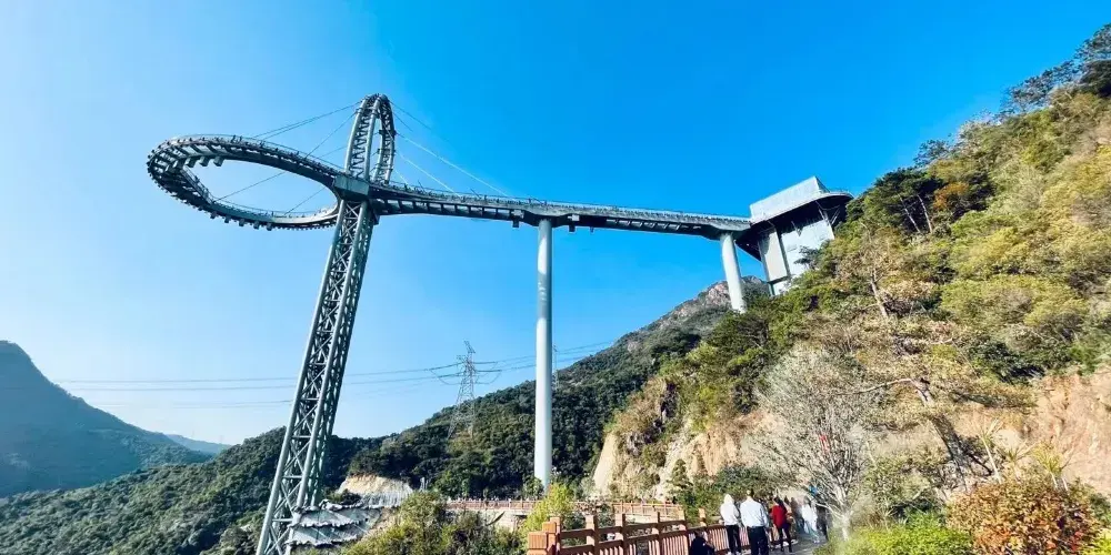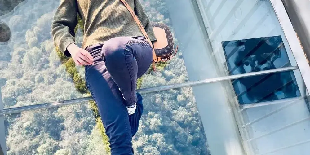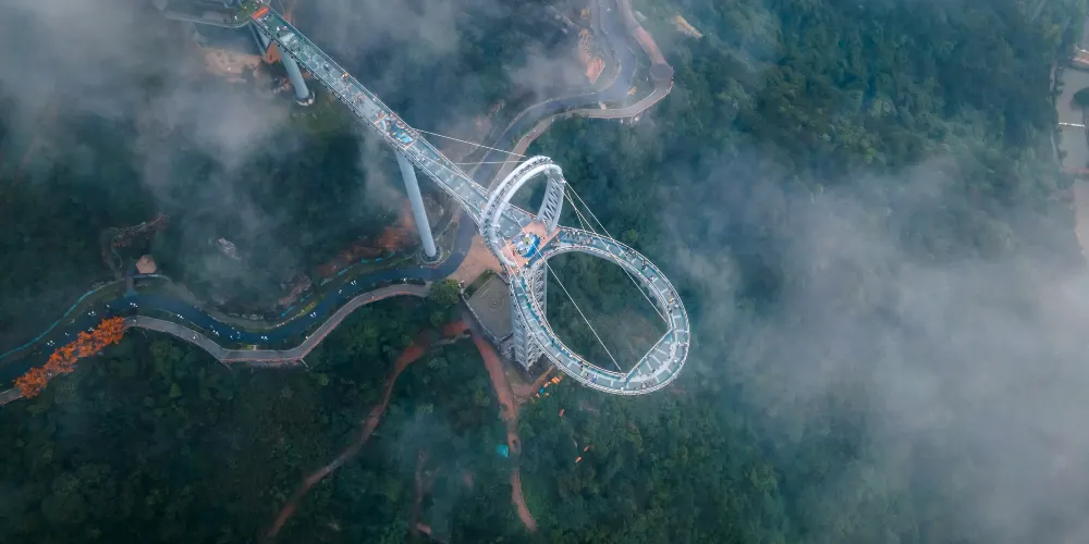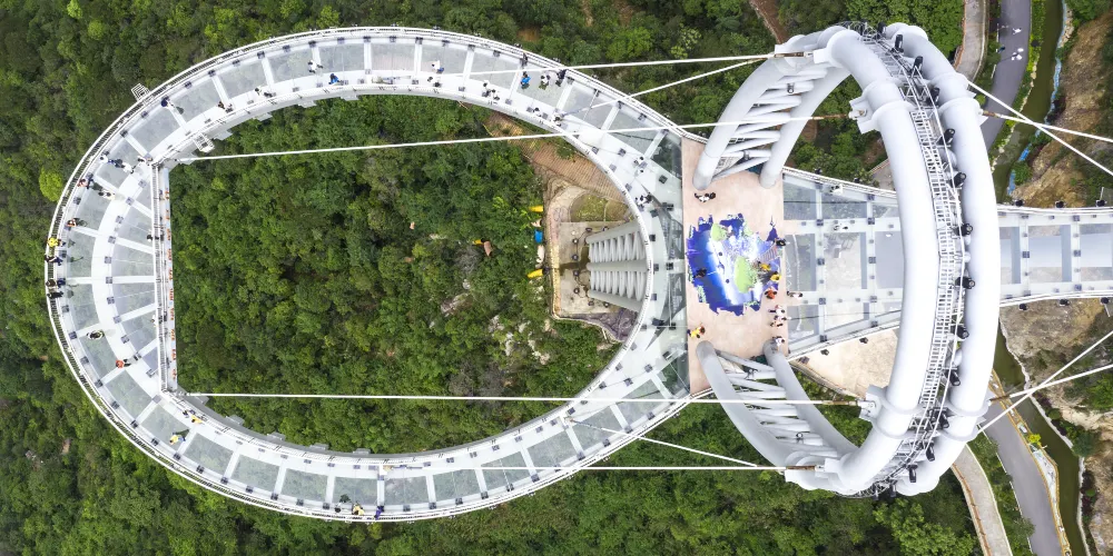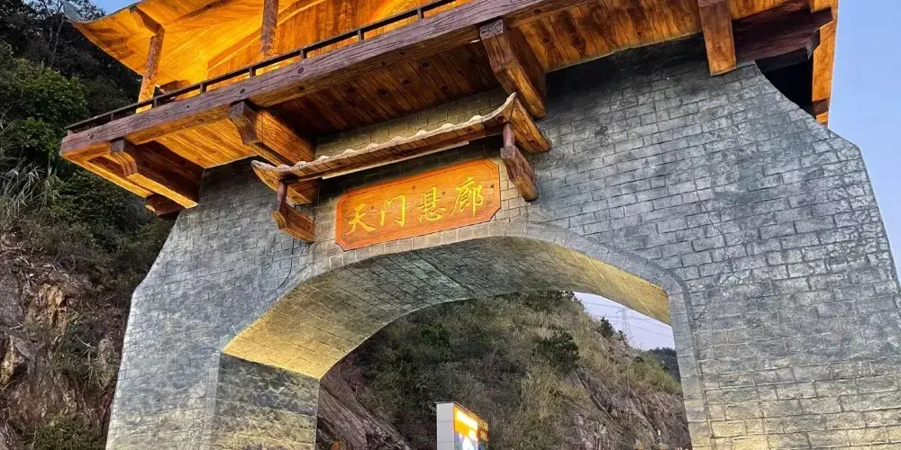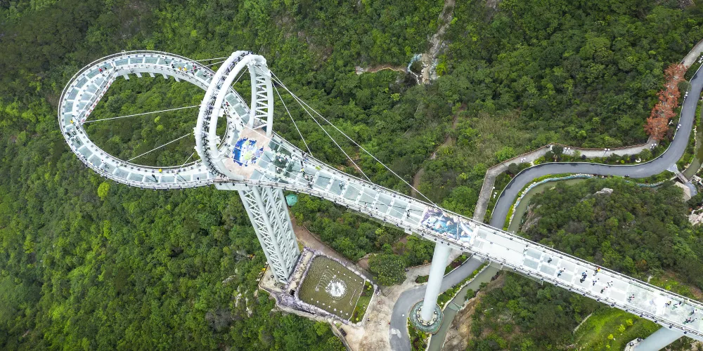 天門懸廊整體由山體伸出直線長度約368米,僅外側單柱懸挑的環形懸廊長度既達168米。旅客前往玻璃廊橋,大部分是為了獲得驚險刺激的高空體驗。懸廊外側處於漂流河道上方,離地垂直高度達500餘米,震憾的高空落差及透明玻璃,帶給遊客無限的驚險體驗,真正達到一步驚心,步步驚心。
