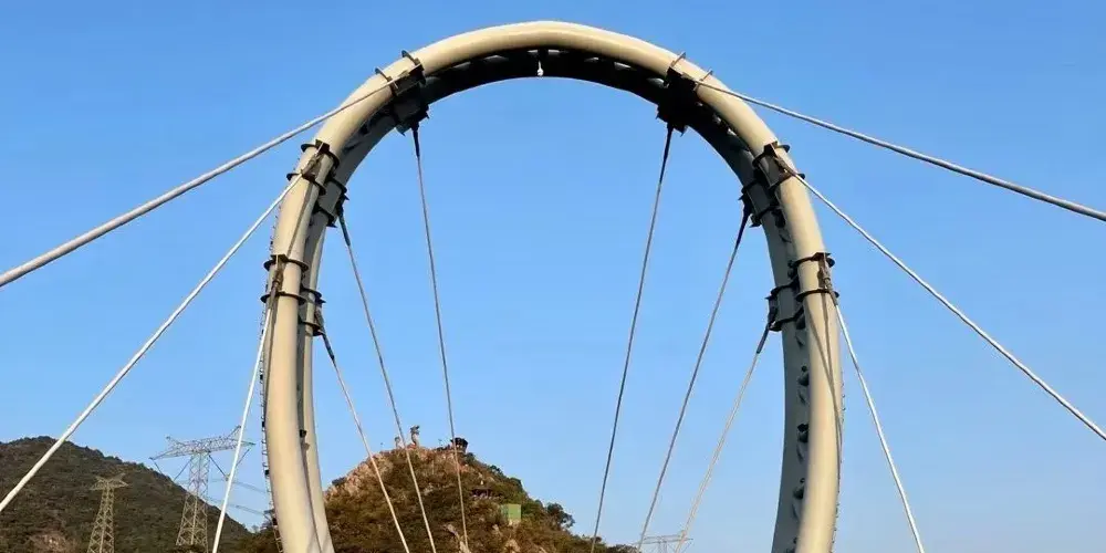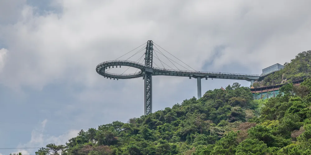 它由三個鋼混結構的巨型立柱支撐,外觀如同雙球拍交叉立於高山之上,直指雲天,被廣大遊客形象地稱為“大球拍”。