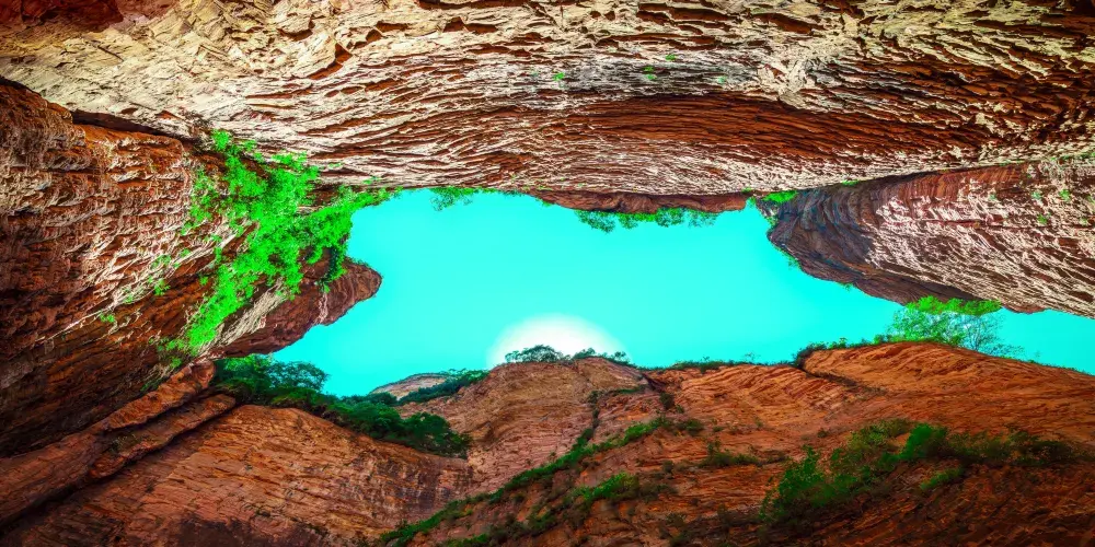 黃崖洞,因在一座海拔一千六百米的黃色崖壁上有一個可容百人的天然山洞而得名,位於黎城縣北東崖底鎮上赤峪村西的板山嶺下。黃崖洞景區有泊龍山莊、甕屹廊、烈士陵園等景點。景區內有一個漢白玉琉璃牌坊,便是入口的甕屹廊。廊的兩側崖頂欲合,仰視如一線天,地勢十分險要。