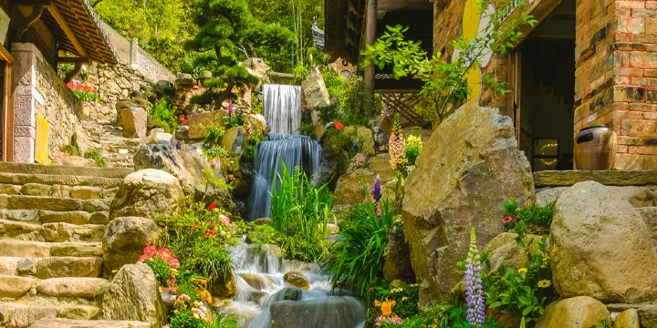 花溪水街,顧名思義沿着潺潺疊水的溪流,以鮮花裝扮一條“坡面上的街市”。是篁嶺景區除古村天街外,又一條特色的商業娛樂街。水街高低錯落佈置有酒吧、咖啡、甜品、茶舍、香道館等休閑業態。花溪水街與古村天街形成環線,還能充分感受篁嶺的古村文化與特色業態。水街佈滿水霧裝置,清涼避暑,坡面上的沿街佈置了以農耕時代為主題的石磨、水碓等景觀。水街多處景觀為網紅打卡點,如石磨流水、懸浮怪屋、許願神樹、流光森林等。