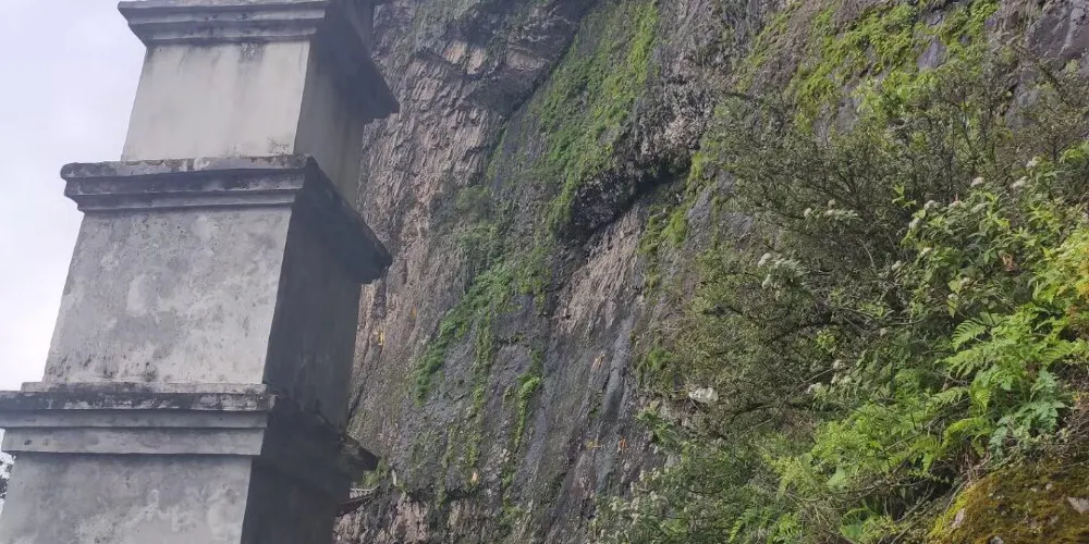 華首門位於雞足山天柱主峯西南面,上承金頂,下臨深淵。在橫凌驚絕的危崖斷裂造就500多米的天然絕壁中部,鑲嵌着一道天地造化的大石門。華首門高40米,寬20米,上部石檐飛突3米,中有一直裂門縫,分為兩扇門,石縫中上部扣懸一把大“石鎖”,將大門緊緊鎖住,儼然緊閉。檐口、門楣清晰明辨,仰觀峭壁危崖直摩蒼穹,搖搖欲墜。從石門俯瞰幽谷深澗,雲霧飄渺,若直九霄,令遊人歎為觀止。華首門聚天地之靈氣,集佛教文化之神祕,容雄、奇、秀、險、靈於一體,是雞足山上不可錯過的景點。