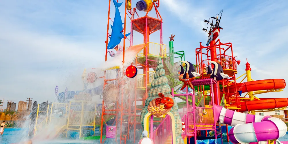 滑滑梯、噴水裝置、互動戲水設施等水上遊樂設備;透過樓梯、網橋、攀爬網等迂迴曲折的連接設計,讓孩子們充分體驗水上運動的樂趣。