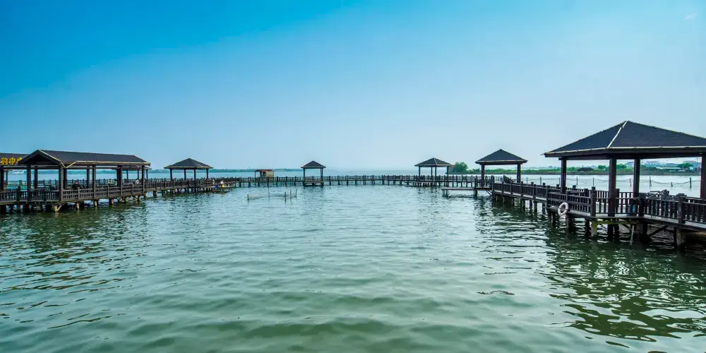 則評價陽澄湖橫跨蘇州市與崑山市,以秋天上市的陽澄湖大閘蟹著稱,蘇州人主要去湖北岸的蓮花島和湖南岸的唯亭鎮吃蟹,上海人多去湖東岸崑山市的巴城。在大閘蟹未上市的時節,到陽澄湖可以觀賞湖景和田園風光,品嚐其他湖鮮。