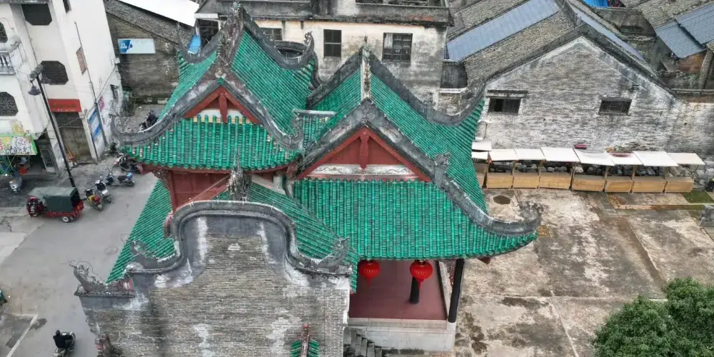 宋御史周渭,因其一生廉潔奉公,頗有政績,死後被朝廷敕封為"忠祜惠烈王"。家鄉百姓感恩德,捐款為他建廟、蠟塑像,現稱周王廟。位於恭城縣城東,建於明成化十四年(1478年),清雍正元年(1723年)重修,是祭祀宋御史周渭的祀廟。由戲台(已毀)、門樓、大殿堂、後殿(已毀)、左右廂房組成。門樓構造具有廣西特色:一是檐柱承下檐,金柱支到上檐,體形在中間驟然收小;二是斗拱主要起裝飾作用。周渭祀門樓的斗拱除有裝飾作用外還有奇特的功能,這種斗拱由座鬥、交互鬥、鴛鴦交手鬥三種形式組合成嚴謹而有規律的蜂窩狀,使氣流通過時產生迴流而發出轟鳴聲,令蝙蝠不敢稍歇,鳥雀恐為築巢,起到自然抵禦蟲鳥侵害的作用。這在古建築中是少有的。在梢間外圍牆壁挑檐上,全樓一千多根堅實木料互相串連吻合,合理承擔上層荷載,使屋面飛檐遠挑,雄偉壯觀,為清代建築所罕見。這些斗拱結構和木構架,是研究古建築的寶貴例證。