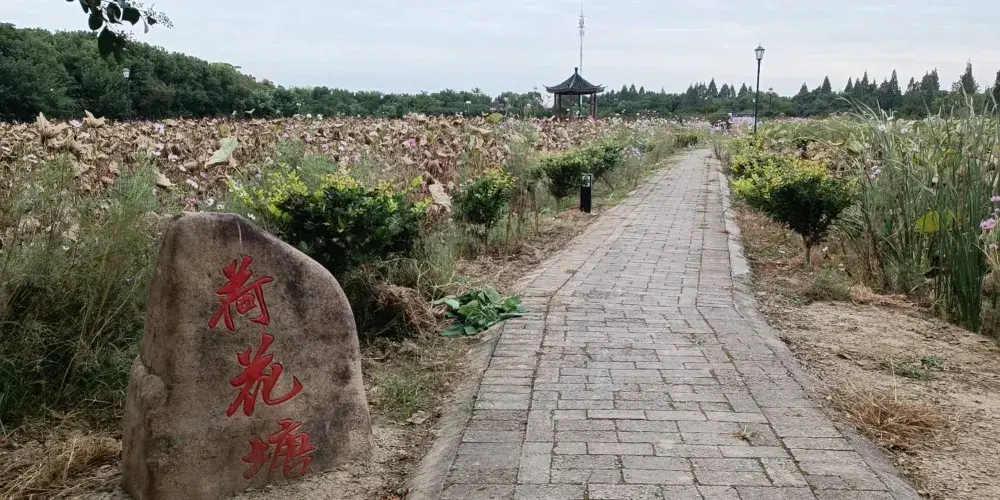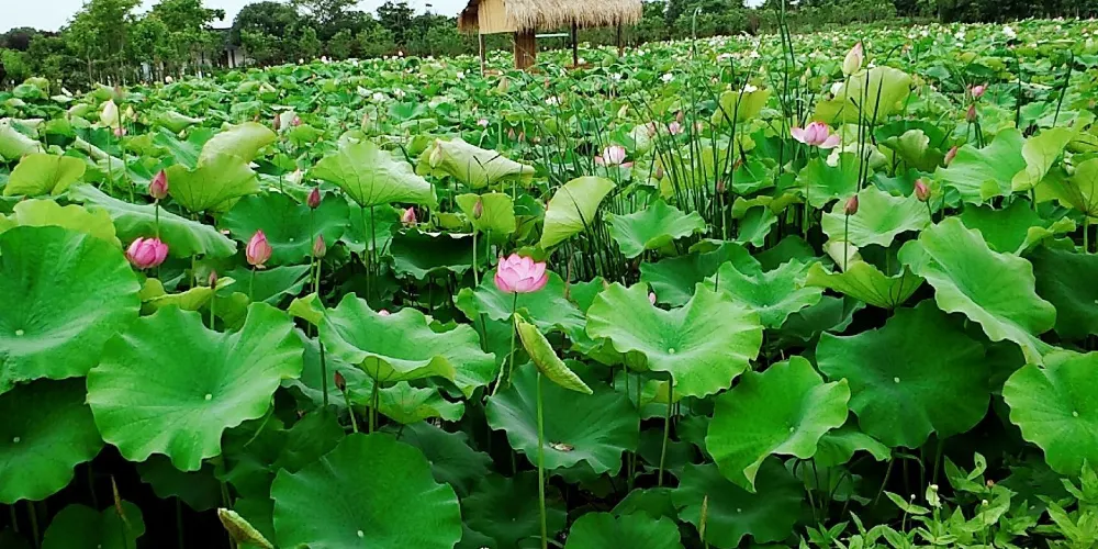 百畝荷花塘環境幽靜,湖水清澈,水天一色。人們可以在這裡邊賞荷花邊喝茶,十分愜意。