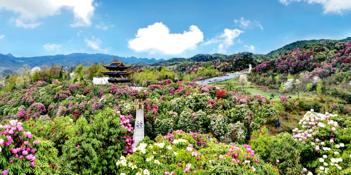 百里杜鵑風景區位於貴州省黔西、大方縣交界處,杜鵑品種、花色多樣,有鮮紅、粉紅、紫色等。難得的是一樹不同花,即一棵樹上開出不同顏色的花朵。據說每年花開時期,天上的仙女都偷偷下凡賞花,與花叢中的姑娘小伙對歌跳舞。因此,這裡就成為每年彝族的插花節、苗族跳花節的理想場所。