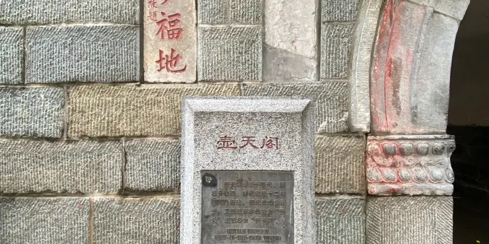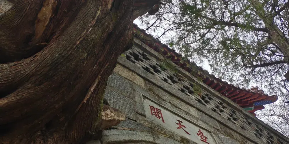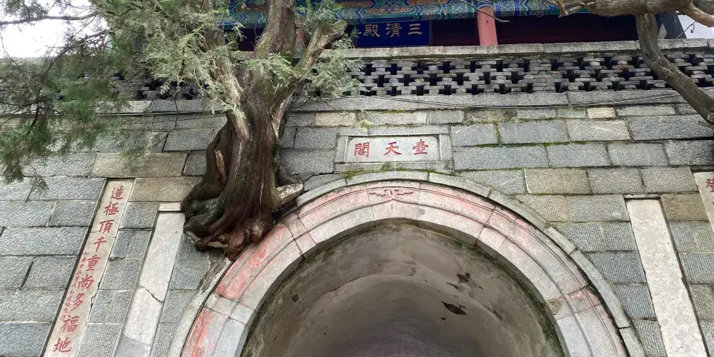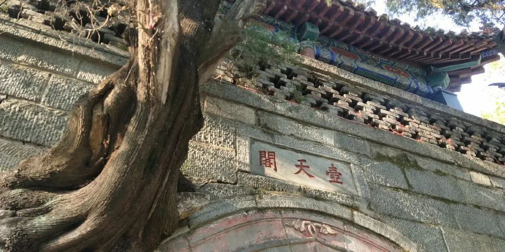 壺天閣位於泰山中路回馬嶺下,明嘉靖年間稱昇仙閣,乾隆十二年拓建改名壺天閣,取自道家以壺天為仙境之意,1979年重建閣樓。壺天閣跨盤道而建,為城門樓式。門洞上鑲石匾額“壺天閣”,是乾隆皇帝登泰山時所題。清嘉慶年間崔映辰題聯“壺天日月開靈境,盤路風雲入翠微。”廷路又題聯“登此山一半以是壺天,造極頂千重尚多福地。”門洞上雙柏橫生,盤結向上,奇偉壯觀。