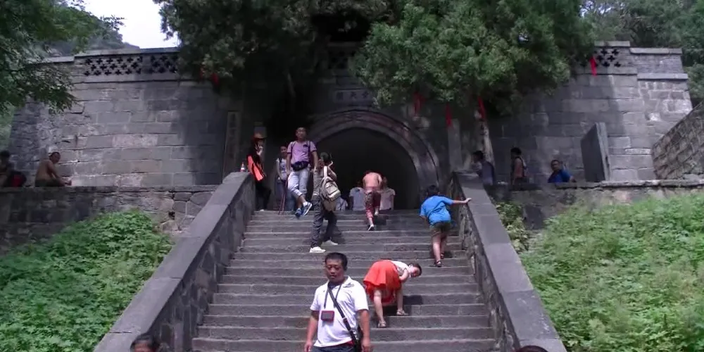 從對鬆山谷底至南天門的山路統稱為“泰山風景名勝區-十八盤”,共有1600多級台階。前393級稱慢泰山風景名勝區-十八盤;中767級為不緊不慢泰山風景名勝區-十八盤;後473級為緊泰山風景名勝區-十八盤。當地有「緊十八,慢十八,不緊不慢又十八」的順口溜。三個泰山風景名勝區-十八盤,不到一公里,垂直高度卻有400餘米,坡度約70-80度,約爬2個多小時,它的陡峭可想而知。兩旁山崖壁如削去了一塊,陡峭的盤路鑲嵌其中,遠遠望去,看起來像天門雲梯。