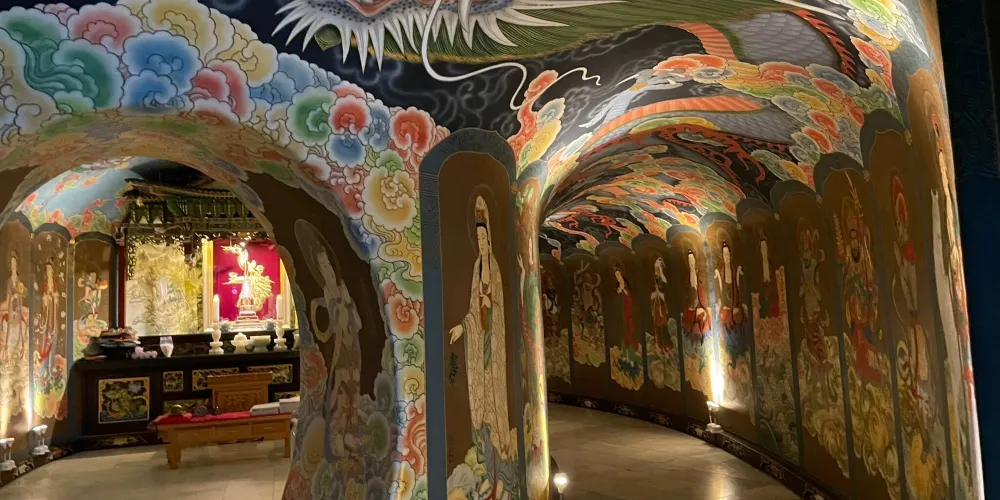 Hyuhyuam簡介:休休庵是寺齡不過10年多的寺院。往寺院後方拾級而下,可看到一塊龜形石,再過去還有一塊自然形成的猶如菩薩躺卧的巖石,龜形石彷彿正在向菩薩參拜,顯得十分神祕。而菩薩右側絕壁上,還有兩塊被稱為僧巖的巖石並列而立,如僧人手持木魚向下方的菩薩合十行禮,令人不禁感歎大自然的鬼斧神工。
