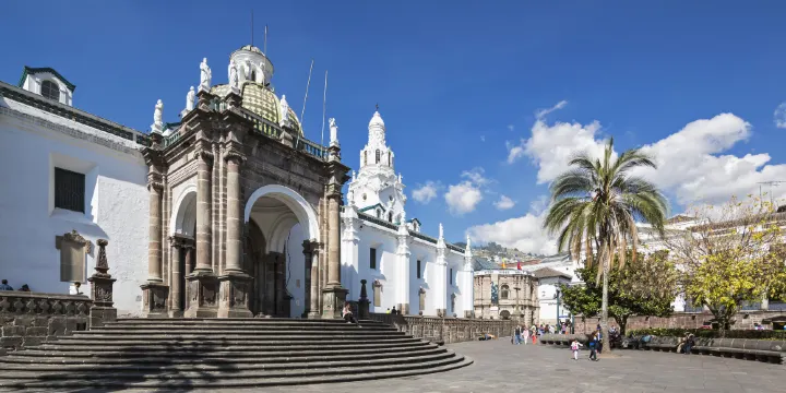 獨立廣場是基多市的中心地帶,在這座正方形廣場四周,聳立著一座座富有意大利文藝複興後期藝術特色的建築。這些建築大多為兩層,配有精雕細刻圖案的石門。廣場南端的天主教堂,始建於1550年,完工於18世紀,綠瓦圓頂,灰白色圓柱支撐門廊,是阿拉伯、波斯和摩爾人的建築風格的混合體。外牆上有用金葉鑲嵌的基多城奠基者姓名,院內有蘇克雷將軍的陵墓。教堂對面是大主宮,廣場西北角是雄偉壯觀的政府宮。