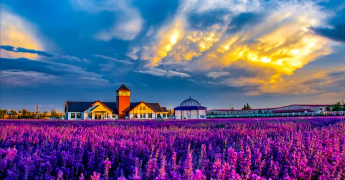伊帕爾汗觀光園位於美麗的新疆伊犁河谷伊寧縣境內,這裏氣候宜人、水草豐美。距離伊寧市30分鐘車程,市內乘線路車、旅遊包車均可到達。觀光園為國家AAA級旅遊景區,集旅遊、觀光、休閑、攝影、購物、餐飲為一體,園區佔地3萬多平方米,由薰衣草和馬鞭草組成的紫色花海為園區主要景觀。每年6月,坐落在紫色花海中的紅頂屋、歐式風車、LOVE牆奪目耀眼;而其中的亭台樓榭則紗幔飄飄風情萬種;園內蝶舞蜂飛,一片繁忙。園區以“紫色觀景與浪漫愛情”為主題,將浪漫情調與大自然相結合,種植了薰衣草、馬鞭草、玫瑰、萬壽菊等多種香草植物,再現大片浪漫花海。聞得到的芳香、觸得到的沁紫,讓眼睛微笑、耳朵唱歌、舌尖跳舞,全方位多角度開啟感官享受。在這裏,儘可放下煩惱,享受這一份恬靜的美好,感受薰衣草帶給我們的寧靜的心動。年輕的男女們更是在這浪漫的氣氛中靜靜醖釀著美麗的愛情。