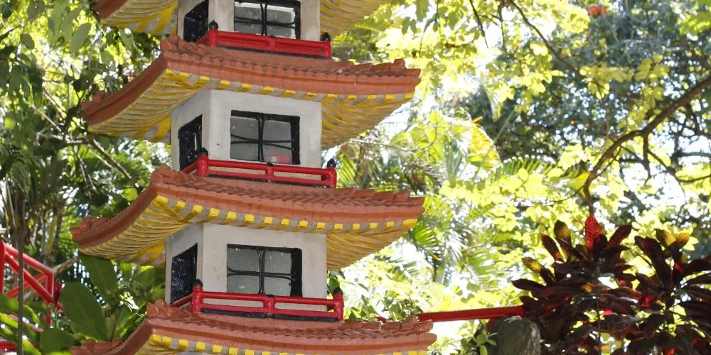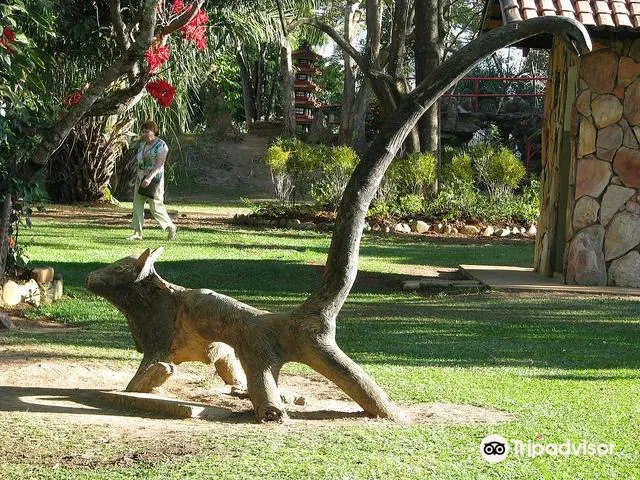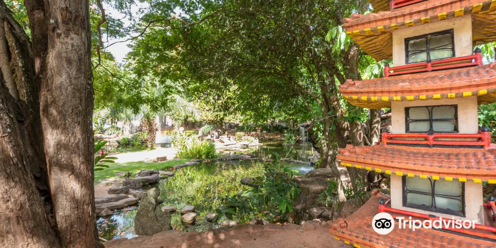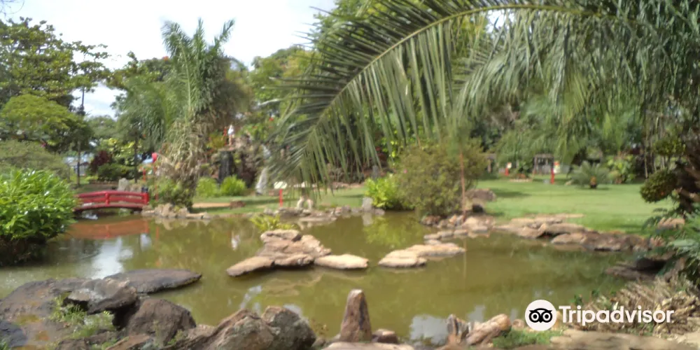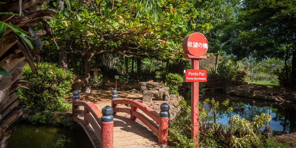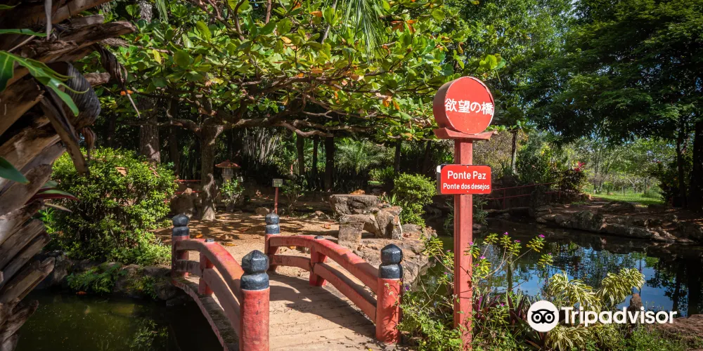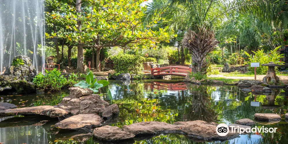 這是一個日式花園,園內有錦鯉池、石燈籠、橋樑等景觀,寧靜而悠閒。
