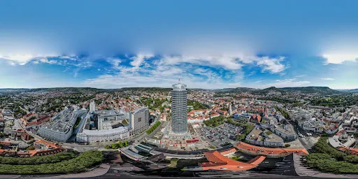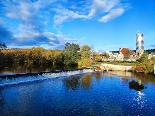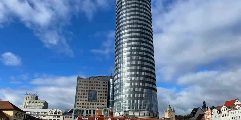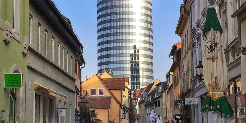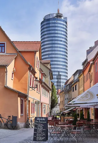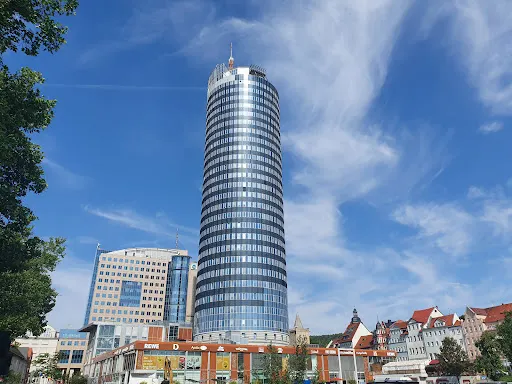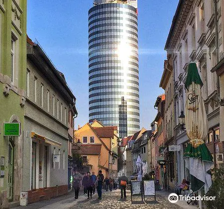 耶恩塔由於它的圓柱體外形也被人們親切地稱作“餅乾卷”,是耶拿的標誌性建築,高達149米,也是前東德地區比較高的建築,樓頂有一個供遊客欣賞城市全景的觀景台,在它的底層還有一個購物中心,頂樓則是一家米其林三星的餐廳。