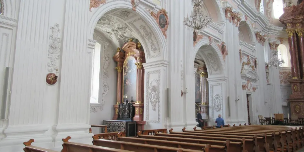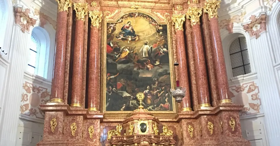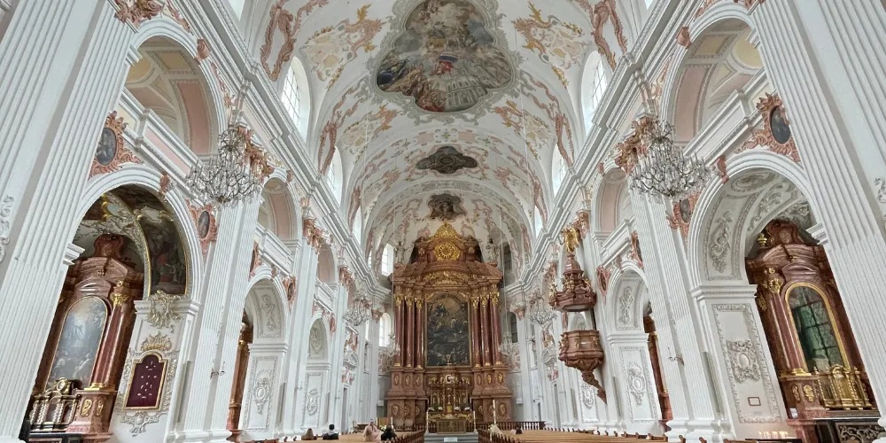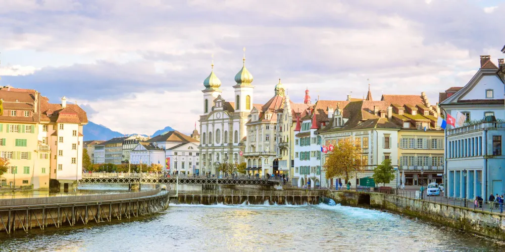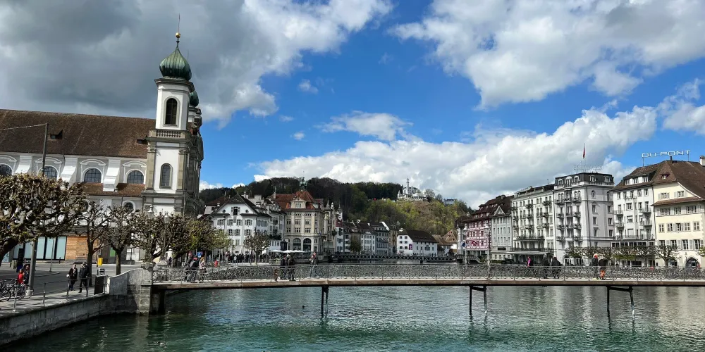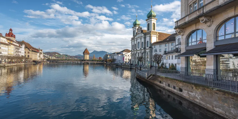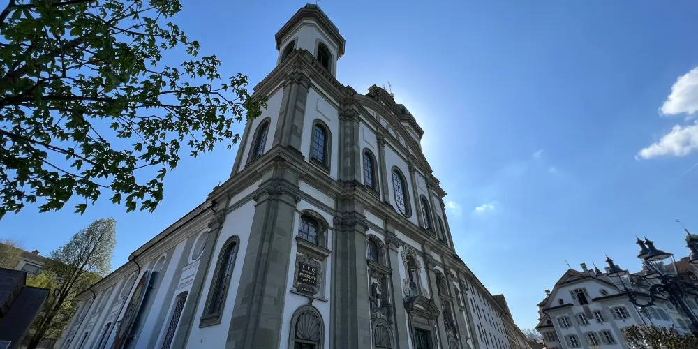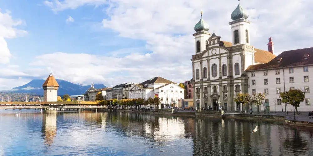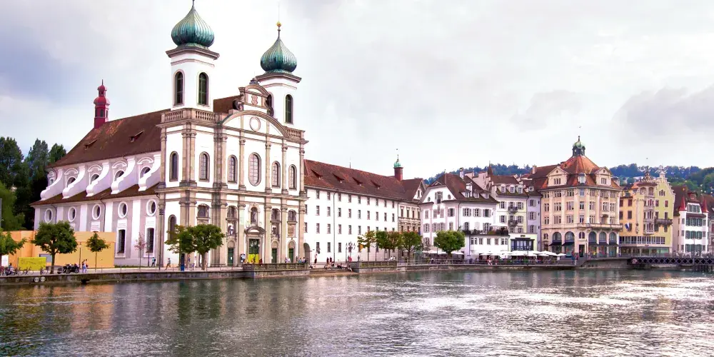 耶穌會教堂隔著羅伊斯河與舊市政廳相對,建於1666年,是瑞士一座大型巴洛克式神殿。18世紀中期,人們重新裝飾了這個拱形屋頂,在這個小教堂裡仍然保留著“瑞士守護神”克勞斯兄弟(Brother Klaus)的僧袍。 教堂位於河邊,離卡佩爾廊橋不遠,從河對岸看過來景色非常漂亮。教堂的外觀很醒目,擁有兩個具有代表性的拱頂裝飾,內部裝飾也十分華麗,尤其是聖具室和寶庫,不可不看。教堂內的聖壇由紅色的大理石裝飾,完成於1681年。