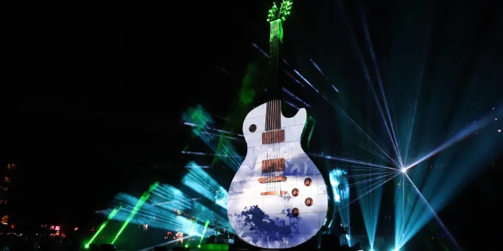 位於中國吉林省集安市鴨綠江畔的集安大吉他主題廣場,是融合音樂文化與城市景觀的標誌性旅遊地標。廣場以巨型吉他雕塑為核心,象徵集安「搖滾之城」的新形象,吸引了許多遊客前來打卡。走進廣場,首先映入眼簾的便是那座高達 19.1 公尺的大吉他雕塑,它造型逼真,主體為鋼結構,外立面採用特殊材質,在陽光的照耀下閃耀著獨特的金屬光澤。夜晚,大吉他雕塑更是大放異彩,燈光秀功能開啟後,各種色彩繽紛的燈光在吉他表面流動、變幻,配合著音樂的節奏,為遊客帶來一場精彩的視聽盛宴。廣場除了大吉他雕塑外,還設有玻璃舞台、燈光秀配套設施等,為各類文藝表演和文化活動提供了良好的場地條件。集安大吉他主題廣場不僅是旅遊景點,更是集安文化的重要像徵,它承載著集安人民對音樂的熱愛和對美好生活的嚮往,也為集安市的文化旅遊產業發展注入了新的活力。