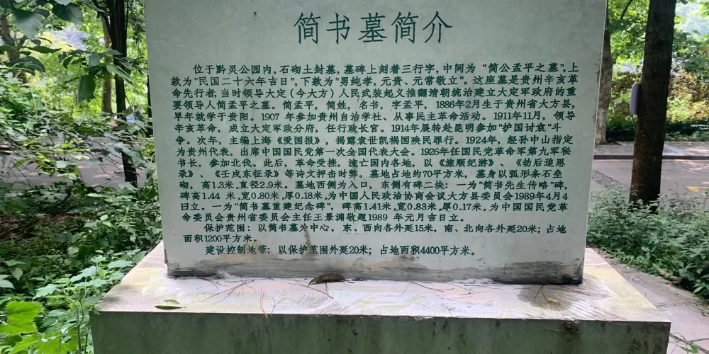 簡書墓位於秀麗的黔靈湖畔,沿着茂密的森林小道拾級而上,約走百餘米開外就能看到。墓四周古木參天,遮廕庇日,墓主人就是貴州辛亥革命先行者,領導大方人民武裝起義推翻清朝統治,建立大方軍政府的重要領導人簡書。墓前石碑刻“簡公孟平之墓”六字,墓地東側有碑兩塊:一為“簡書墓重建紀念碑”,一為“簡書先生傳略”碑。簡書是貴州辛亥革命的先行者,簡書的一生對研究貴州辛亥革命史有着一定的歷史價值。1987年5月貴陽市人民政府公佈簡書墓列為市級文物保護單位。
