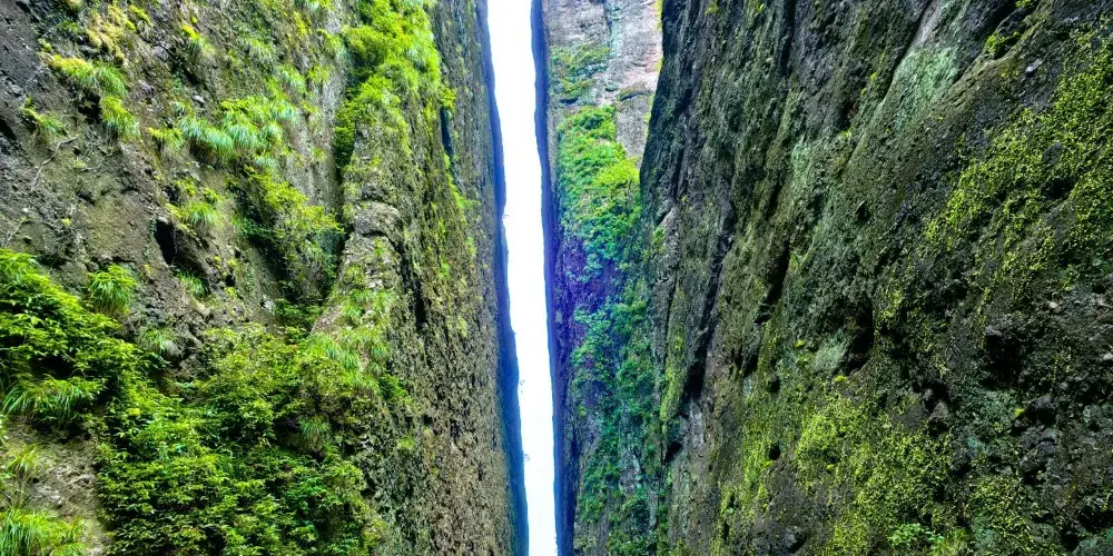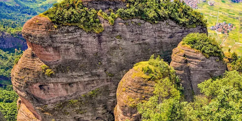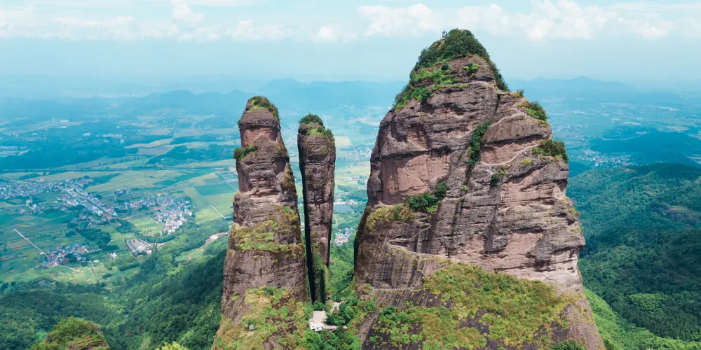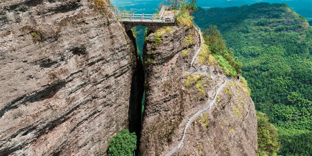 江郎山由石峰郎峰、石柱亞峰、石牆靈峰組成,三塊巨石就像從地面上長出來的三根石筍,像一個“川”字,是典型的丹霞地貌。在這裡爬山感覺很刺激,幽深的一線天、大段近乎垂直的陡階,順著崖壁上幾乎垂直的陡階登頂江郎山,其艱險不輸華山。