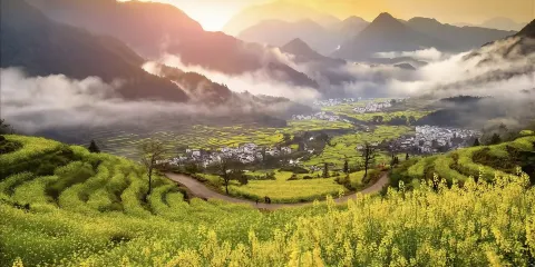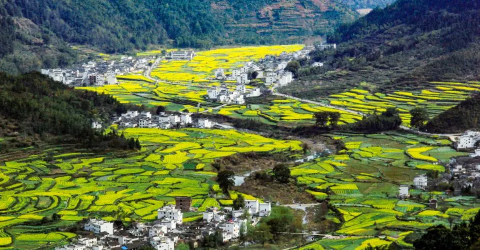 江嶺地處婺源縣東北,南臨曉起,東接溪頭,是婺源田園風光的代表。春季油菜花開的時候,站在山頂的觀景台上,可以俯瞰到漫山遍野的油菜花田。田間還有幾個小小的村落,黑瓦白牆的徽派民居夾雜在一片金黃之間,實在是漂亮極了。