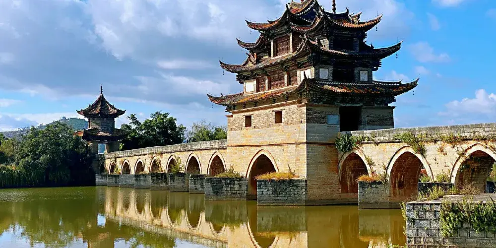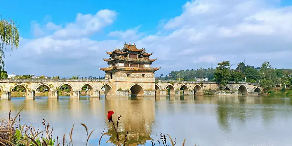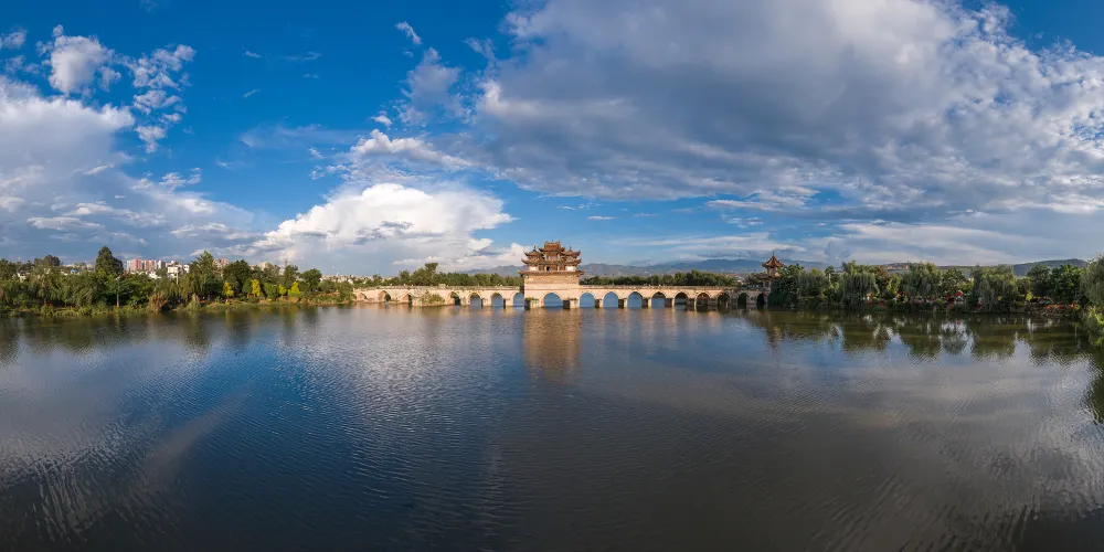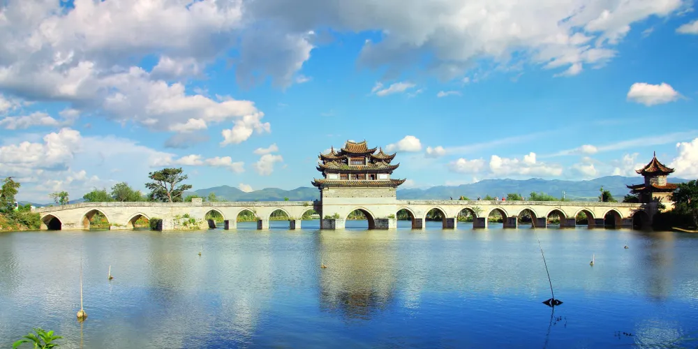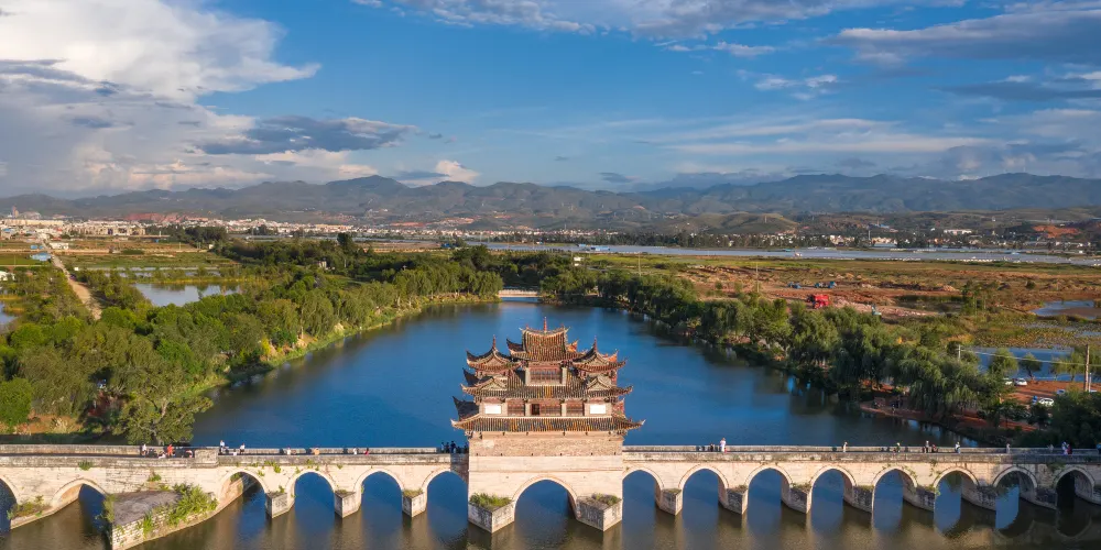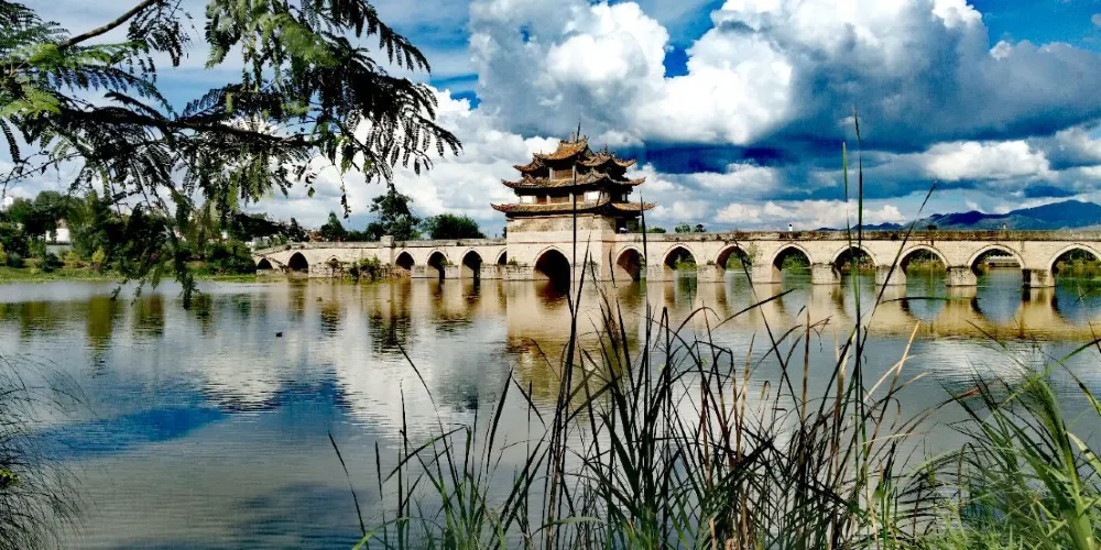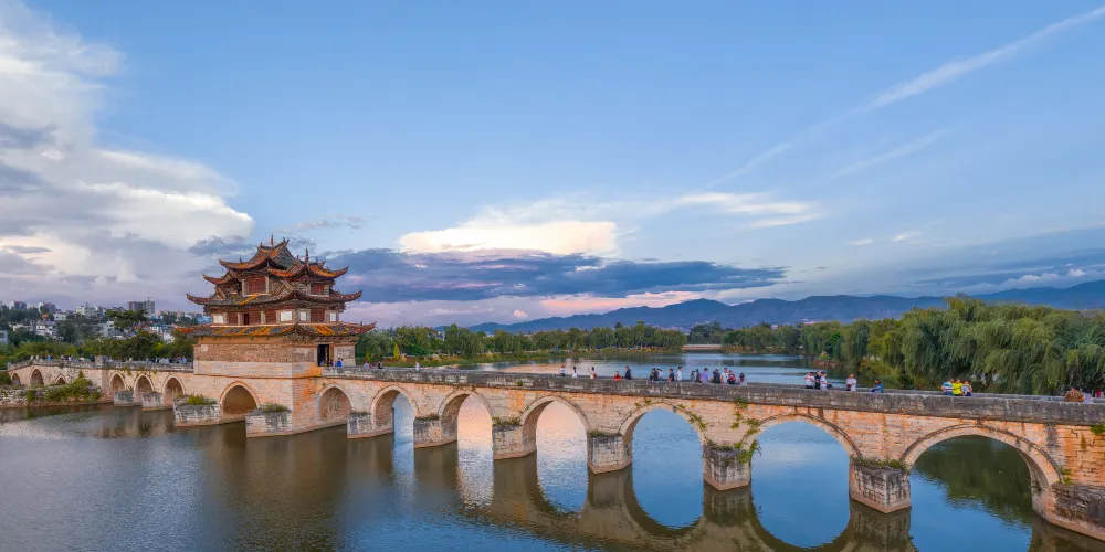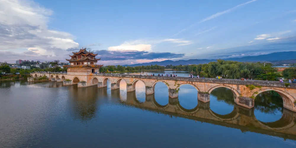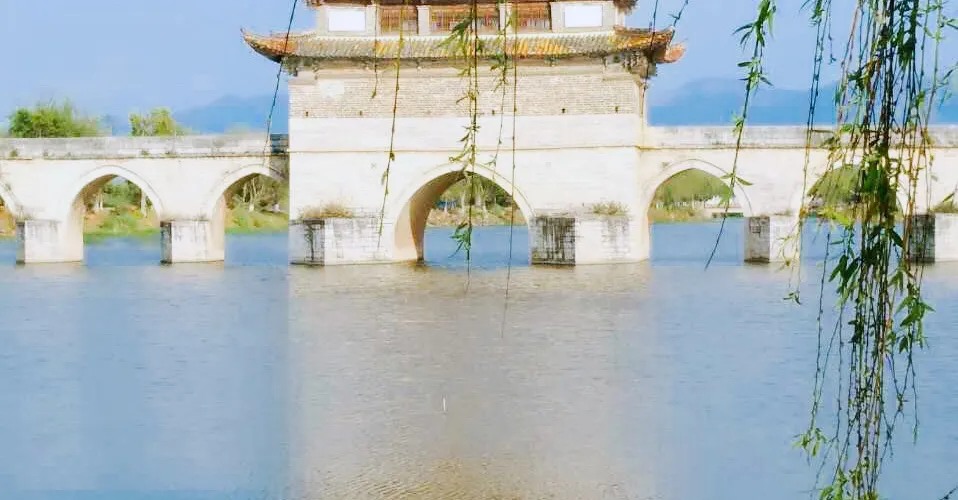 建水十七孔橋,俗稱雙龍橋,位於建水古城的西邊5公裡處,橫跨在瀘江和踏沖河交匯處。這座古橋建在清朝年間,是雲南的一處有名的古迹,古橋一共有17孔相連,橋上還有三層樓閣,顯得古老又很有氣派,遠看像一艘浮在水面上的大船。