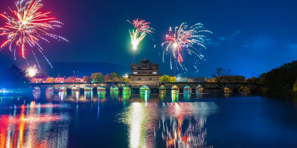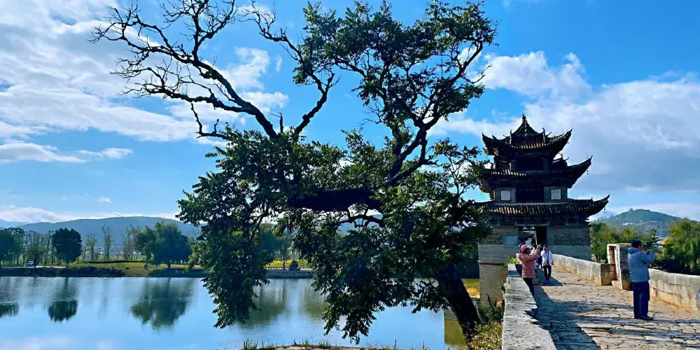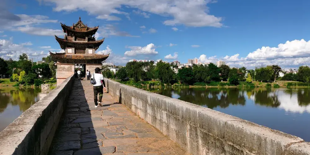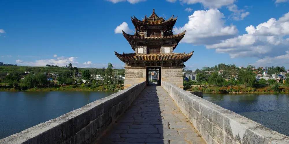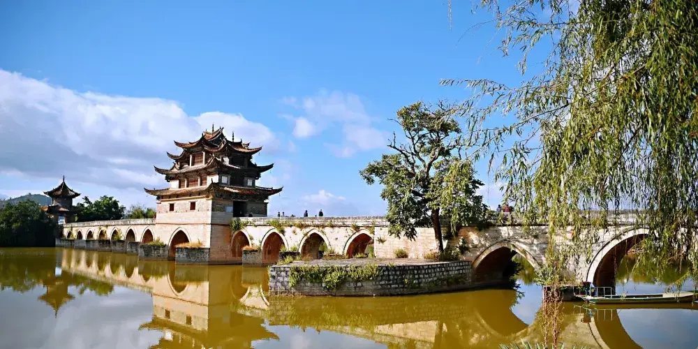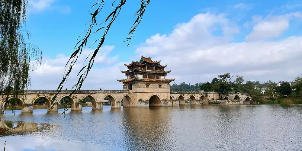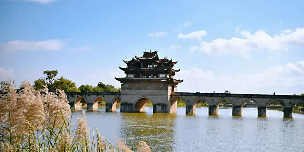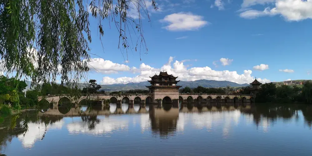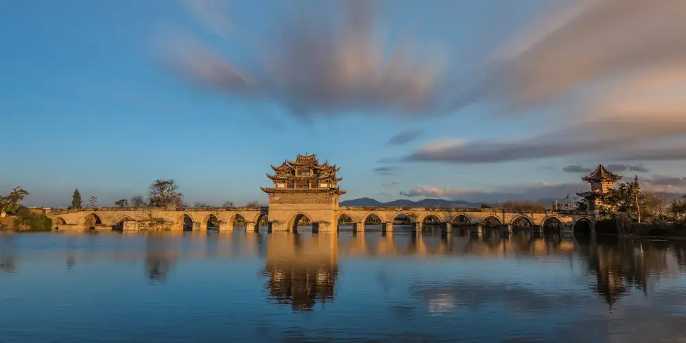 建水十七孔橋,俗稱雙龍橋,位於建水古城的西邊5公裡處,橫跨在瀘江和踏沖河交匯處。這座古橋建在清朝年間,是雲南的一處有名的古迹,古橋一共有17孔相連,橋上還有三層樓閣,顯得古老又很有氣派,遠看像一艘浮在水面上的大船。