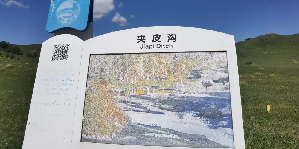 這裡在建場初期,由於冬季雪比較大,且須經過一條窄窄的溝方能到達,酷似電影《林海雪原》中夾皮溝的場景,從此場職工就把這裏稱為夾皮溝。夾皮溝草深林茂,有白樺,有沼澤地,有蘑菇圈,有野山楂樹、山葡萄樹和山丁樹,有野玫瑰,百花坡、有野鴨湖夾皮溝風景區是軍馬場植被好的區域之一。