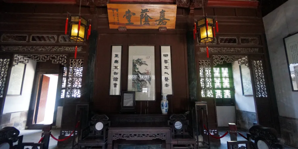 嘉蔭堂主建築系仿明代結構,俗稱“紗帽廳”。因梁頭棹木像明代官帽的帽翅,故名。庭院高大寬敞,肅穆莊重。建築雕樑畫棟,頗為精美,尤其是五架梁兩側中心刻有“八駿圖”,梁兩端刻有“鳳穿牡丹”。梁底則刻有“稱心如意”、“必定高中”等圖案。“紗帽翅”(即梁頭棹木)上刻有《三國演義》中的“古城會、三英戰呂布”等八幅戲文透雕,形象逼真,呼之欲出。