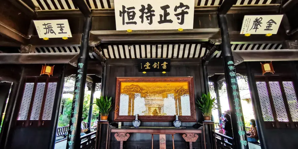 金庸書院座落於海寧鹽官古鎮的海神廟西南,參照古城內原有建於清嘉慶年間的安瀾書院之建築格局設計建造,分東、中、西三路。東路為引導、居住空間,是休憩之所;中路為主體空間,有講學、展示和藏書三大功能;西路為接待、服務空間,是遊賞佳處。書院較為全面地展示了金庸先生的學術成就,是金庸先生回鄉講學、傳播學術思想的聖地。