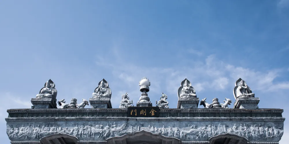 金剛門,位於沂蒙山旅遊區(蒙山國家森林公園)入口處,為一座佛教主題廣場,全稱般若波羅蜜金剛門,門柱由八尊整石雕鑿的金剛塑像組成。金剛門為泰國皇恩寺釋聖智以其夢境創意設計,福建泉州石雕工藝大師精心營造,建築風格中西結合、陰陽和諧,氣勢雄偉,工藝精湛,堪為傳世精品,既體現傳統之繼承與發展,亦表達人文與自然之和諧統一,為沂蒙山人文地理重要標誌。