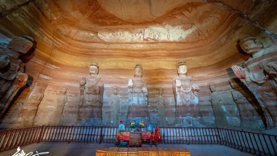 3.8 分21 則評價距離市中心 距離市中心8.5公里南石窟寺與甘肅慶陽北石窟寺系同一時期開鑿,均為北魏涇州剌史所造,被譽為“南北石窟雙明珠”。南石窟寺現存石龕5個,衹有一、四窟有造像。一號窟是主窟,窟門兩旁開有方龕於壁巖之上。窟高13米,長17米,寬24米,呈長方形。窟頂為復鬥型,結構獨特,造型宏偉,門上設明窗。入窟門,迎面三壁圍站着高6米的七尊佛像。這種七佛一堂排列格式,在國內大石窟中均未有見。七佛頭、手大於正常比例,體型較肥矮,樸實健壯,呈北方民族氣魄。佛像高鼻大耳,面部豐滿,表情慈祥,形態淳厚,神情肅穆,居高臨下,俯覽眾生。七佛間雕有脅侍菩薩十三尊,儀態秀曼,婷婷玉立。窟頂還雕有傳教故事,描繪釋迦牟尼自誕生至出家的情節,造型生動,頗有生活情趣,是一件藝術珍品。四號窟為唐代開鑿,洞窟為5平方米,呈方形,泥塑造像,正中供文殊菩薩、普賢菩薩和觀音菩薩,兩側壁畫有六力士、八大菩薩形象。南石窟代表着中國佛教石窟別具一格的藝術形式。