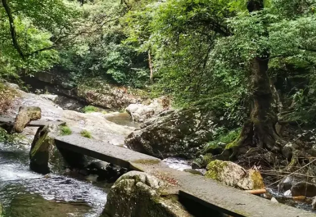 沿着井岡山水口的溪流往裡走,衹見兩邊石峯對峙,山壁似刀削斧砍,構成了一條深邃大峽谷。峽谷間,古木參天,山巖垂懸,林木葱葱,山鶯飛翔,松鼠跳躍,百泉彈琴。谷底一條清流,溪水清幽明澈,水中有一景觀"金牛戲水"。一塊磐石在水中如一巨牛當水而卧,惟妙惟肖,彷彿它也被這裏的山清水秀所吸引。