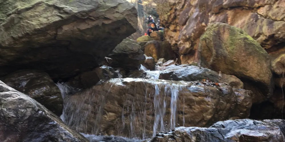 九峰山網嶴景區由一條長達上千米的峽谷貫穿,包括眾多景點。進入景區,先是一個炊煙四起的野外燒烤場,繞過燒烤場過臥龍橋,這裡有祈雨壇和祈雨殿,是以前百姓為祈求風調雨順而建;順小道漫步,沿途綠樹成蔭,風景優美,有壯觀的瀑布飛流直下,然後登上松風茶莊,不僅可以歇息,還可在平台上仰視巍峨的山峰。