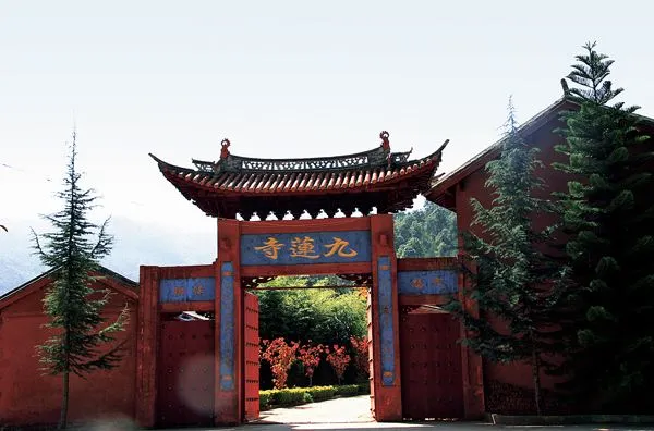 九蓮寺在雞足山靈山一會坊西面,始建於明嘉靖年間。該寺佈局精巧玲瓏,院中蘭桂幽香,花木扶疏,環境優雅。寺外有大片百年板栗園,景緻極美。現有建築主要是三聖殿、天王殿、石牌坊等。寺內有柏樹一株,已有數百年的歷史。該寺歷代皆為接待寺,寺中住比丘尼,接待用素食,色香味俱佳,形態逼真,為佛家素食瑰寶。常有賓客慕名品素食,歎為奇絕。