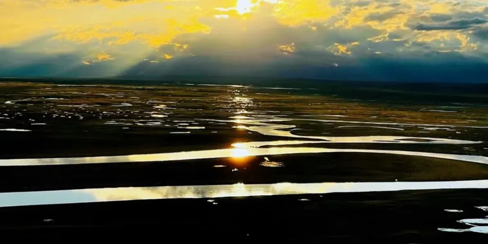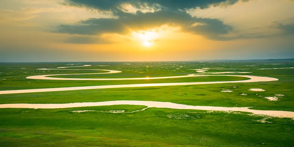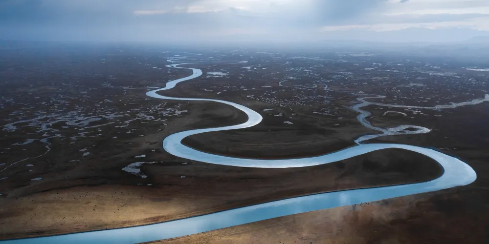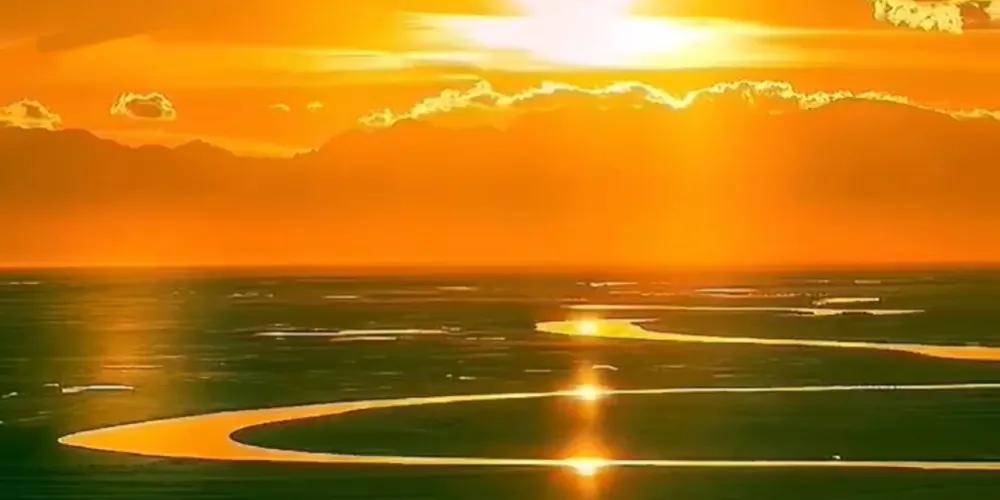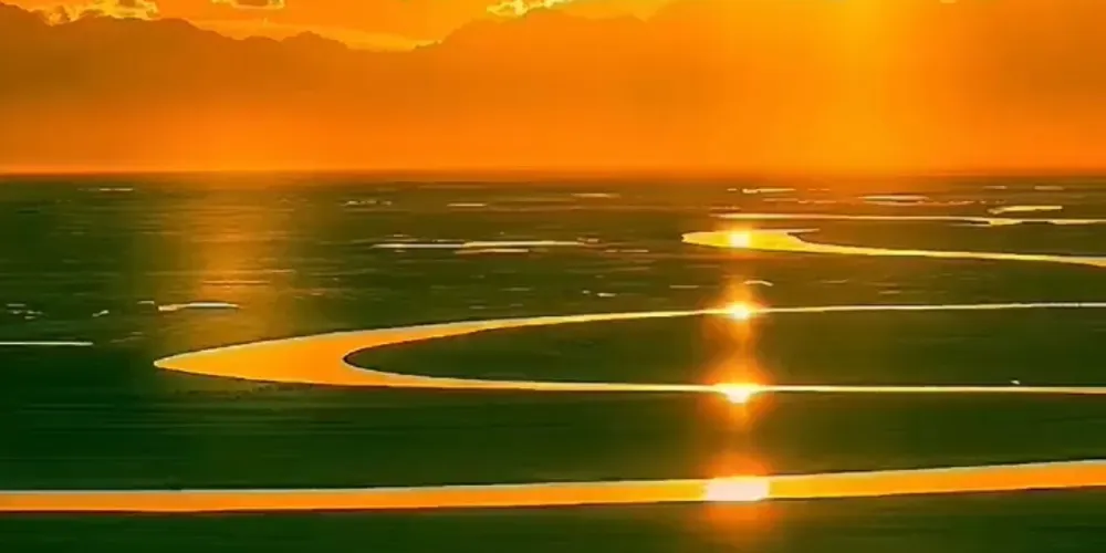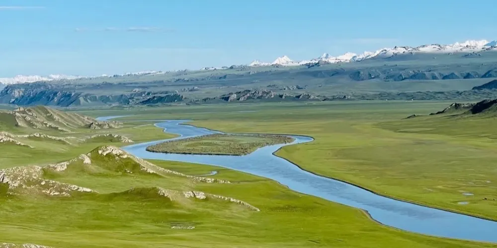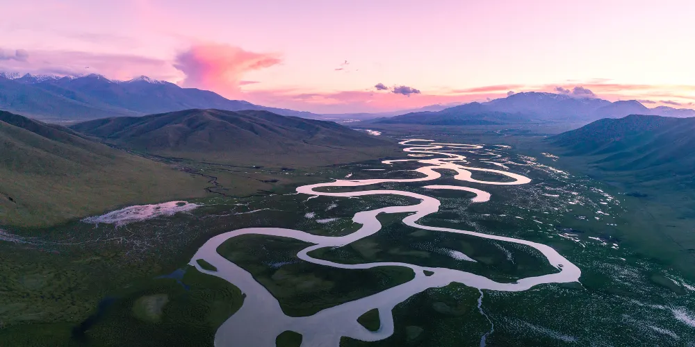 九曲十八彎位於闊克蘇大峽谷景區,在此可欣賞闊克蘇河在巍峨天山映襯下的秀麗美景。闊克蘇河在闊克蘇大峽谷寬廣的谷底曲折流轉,如蛟龍過境迂迴向前,形成南北長約5600餘米、東西寬約2000餘米的九曲十八彎。周圍羣山環繞,山巒重疊,谷間河水平緩,波光蕩漾,河岸植被鬱鬱葱葱,炊煙和着林間輕霧,牧民的氈房若隱若現點綴其間,晨曦落霞中隱現着山巒柔美的線條,意境優美。
