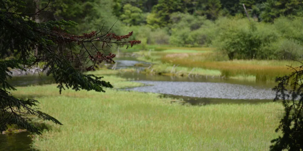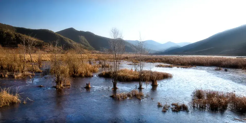 箭竹海中有一種奇特的景觀,即是湖水中有一些鈣化形成的枯木,有時枯木半露出水面,在上面還會有新生的樹苗紮根,這種現象稱為腐木更新,或枯木逢春。